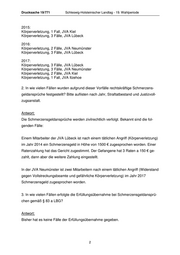 Drucksache 19/771 Schleswig-Holsteinischer Landtag - 19. Wahlperiode 2015: Körperverletzung, 1 Fall, JVA Kiel Körperverletzung, 3 Fälle, JVA Lübeck 2016: Körperverletzung, 2 Fälle, JVA Neumünster Körperverletzung, 3 Fälle, JVA Lübeck 2017: Körperverletzung, 3 Fälle, JVA Lübeck Körperverletzung, 3 Fälle, JVA Neumünster Körperverletzung, 2 Fälle, JVA Kiel Körperverletzung, 1 Fall, JVA Itzehoe 2. In wie vielen Fällen wurden aufgrund dieser Vorfälle rechtskräftige Schmerzens- geldansprüche festgestellt? Bitte auflisten nach Jahr, Straftatbestand und Justizvoll- zugsanstalt. Antwort: Die Schmerzensgeldansprüche werden zivilrechtlich verfolgt. Bekannt sind die fol- genden Fälle: Einem Mitarbeiter der JVA Lübeck ist nach einem tätlichen Angriff (Körperverletzung) im Jahr 2014 ein Schmerzensgeld in Höhe von 1500 € zugesprochen worden. Einer Ratenzahlung hat das Gericht zugestimmt. Der Gefangene hat 3 Raten a 150 € ge- zahlt, dann aber die weitere Zahlung eingestellt. In der JVA Neumünster ist zwei Mitarbeitern nach einem tätlichen Angriff (Widerstand gegen Vollstreckungsbeamte und gefährliche Körperverletzung) im Jahr 2017 Schmerzensgeld zugesprochen worden. 3. In wie vielen Fällen erfolgte die Erfüllungsübernahme bei Schmerzensgeldansprü- chen gemäß § 83 a LBG? Antwort: Bisher hat es keine Fälle der Erfüllungsübernahme gegeben. 2