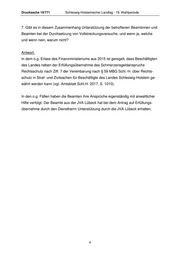Drucksache 19/771 Schleswig-Holsteinischer Landtag - 19. Wahlperiode 7. Gibt es in diesem Zusammenhang Unterstützung der betroffenen Beamtinnen und Beamten bei der Durchsetzung von Vollstreckungsversuche, und wenn ja, welche und wenn nein, warum nicht? Antwort: In dem o.g. Erlass des Finanzministeriums aus 2015 ist geregelt, dass Beschäftigten des Landes neben der Erfüllungsübernahme des Schmerzensgeldanspruchs Rechtsschutz nach Ziff. 7 der Vereinbarung nach § 59 MBG Schl.-H. über Rechts- schutz in Straf- und Zivilsachen für Beschäftigte des Landes Schleswig-Holstein ge- währt werden kann (vgl. Amtsblatt Schl.H. 2017, S. 1010). In den o.g. Fällen haben die Beamten ihre Ansprüche eigenständig mit anwaltlicher Hilfe verfolgt. Der Beamte aus der JVA Lübeck hat bei dem Antrag auf Erfüllungs- übernahme durch den Dienstherrn Unterstützung durch die JVA Lübeck erhalten. 4