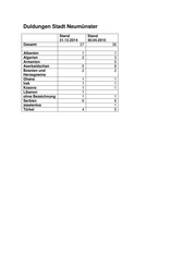 Duldungen Stadt Neumünster Stand Stand 31.12.2014 30.04.2015 Gesamt 27 36 Albanien 1 1 Algerien 2 3 Armenien 5 Aserbaidschan 5 8 Bosnien und 2 2 Herzegowina Ghana 1 1 Irak 1 1 Kosovo 1 1 Libanon 1 ohne Bezeichnung 1 1 Serbien 6 6 staatenlos 1 Türkei 4 5