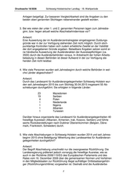 SCHLESWIG-HOLSTEINISCHER LANDTAG Drucksache 18/3036 18. Wahlperiode 2015-06-10 Kleine Anfrage der Abgeordneten Astrid Damerow (CDU) und Antwort der Landesregierung – Minister für Inneres und Bundesangelegenheiten Ausreisepflichtige Personen in Schleswig-Holstein Vorbemerkung der Landesregierung: Zur Erhebung der Angaben zu den Fragen 1 und 2 wurde die Statistik des Auslän- derzentralregisters zu den Stichtagen 31. Dezember 2014 und 30. April 2014 ausge- wertet. Dabei wurden Eintragungen zu Staaten festgestellt, die nicht mehr existieren (z.B. Jugoslawien). Die Plausibilität dieser Angaben muss bezweifelt werden, kann aber seitens der Landesregierung nicht überprüft werden, da außer den Zahlenan- gaben keine persönlichen Daten der Personen bekannt sind. Vollständigkeit und Richtigkeit können deshalb nicht garantiert werden. Anstelle der Ausreisepflichtigen wurden die Personen erhoben, deren Aufenthalt ge- duldet wird, d.h. die vollziehbar ausreisepflichtig sind. Die Zahl der Ausreisepflichti- gen ist deutlich höher, weil darunter auch Personen fallen, deren Ausreiseverpflich- tung noch nicht vollziehbar ist. 1. Wie viele Personen aus welchen Herkunftsstaaten waren in Schleswig- Holstein zum Jahresbeginn in welchen Kreisen und kreisfreien Städten aus- reisepflichtig? 2. Wie viele Personen aus welchen Herkunftsstaaten sind aktuell in welchen Kreisen und kreisfreien Städten ausreisepflichtig? Antwort zu Fragen 1 und 2: Die Zahlenangaben für das Land Schleswig-Holstein, für die Kreise und kreis- freien Städte sowie für das Landesamt für Ausländerangelegenheiten und die hiesige Außenstelle des Bundesamtes für Migration und Flüchtlinge sind als