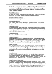 Schleswig-Holsteinischer Landtag - 18. Wahlperiode Drucksache 18/3036 hörden des Landes gebeten worden, auch die freiwilligen Ausreisen mitzutei- len, die ohne Beteiligung/Mitwirkung des Landesamtes für Ausländerangele- genheiten organisiert wurden. Im Einzelnen haben die Kreise und kreisfreien Städte folgendes mitgeteilt: Kreis Dithmarschen: 2014 hat der Kreis 40 freiwillige Ausreisen organisiert. In den ersten Monaten des Jahres 2015 hat es bereits 29 freiwillige Ausreisen gegeben. Kreis Herzogtum Lauenburg: Der Kreis hat Fehlanzeige gemeldet. Landeshauptstadt Kiel: Von 2014 bis heute wurden 4 Familien in ihrer Heimatländer zurückgeführt. Die genaue Personenzahl konnte nicht ermittelt werden. Hansestadt Lübeck: In diesem Jahr hat Lübeck einen Polen mithilfe der Landespolizei in sein Hei- matland zurückgeführt. Das Landesamt für Ausländerangelegenheiten war le- diglich eingeschaltet, um die Rückführung mit der Bundespolizei und den pol- nischen Behörden abzustimmen. Stadt Neumünster: Neumünster hat Fehlanzeige gemeldet. Kreis Nordfriesland: Bislang wurde grundsätzlich jede Abschiebung bzw. Ausreise über das Lan- desamt für Ausländerangelegenheiten organisiert. Mitte Mai 2015 hat es eine freiwillige Ausreise gegeben, an der das Landesamt nicht beteiligt war. Die be- troffene Person hatte die Rückreise selbst organisiert und bezahlt. Kreis Ostholstein: Seit Jahresbeginn wurden keine Abschiebungen ohne Beteiligung/Mitwirkung des Landesamtes für Ausländerangelegenheiten durchgeführt. Freiwillige Aus- reisen werden generell ohne Beteiligung des Landesamtes organisiert. Seit Jahresbeginn 2015 wurden freiwillige Ausreisen für insgesamt 32 Personen eingeleitet. Kreis Pinneberg: Im Kreis Pinneberg wurden im Jahr 2014 und auch 2015 keine Abschiebun- gen ohne Beteiligungen des Landesamtes für Ausländerangelegenheiten durchgeführt. Im Jahr 2014 gab es ca. 50 freiwillige Ausreisen, in diesem Jahr haben bereits ca. 40 Personen das Land freiwillig wieder verlassen. Kreis Rendsburg-Eckernförde: Im Jahr 2014 wurden für insgesamt 7 Personen und im Jahr 2015 für 11 Per- sonen eine freiwillige Ausreise ohne Beteiligung des Landesamtes organisiert. Es handelt sich hierbei um Personen, deren Ausreise über den Kreis finanziert wurde. Personen, die ohne finanzielle Unterstützung ausgereist sind, können im Nachhinein nur über Durchsicht der Ausländerakten erhoben werden. 3
