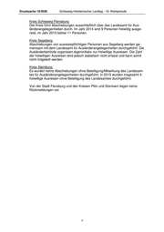 Drucksache 18/3036 Schleswig-Holsteinischer Landtag - 18. Wahlperiode Kreis Schleswig-Flensburg: Der Kreis führt Abschiebungen ausschließlich über das Landesamt für Aus- länderangelegenheiten durch. Im Jahr 2014 sind 9 Personen freiwillig ausge- reist, im Jahr 2015 bisher 11 Personen. Kreis Segeberg: Abschiebungen von ausreisepflichtigen Personen aus Segeberg werden ge- meinsam mit dem Landesamt für Ausländerangelegenheiten durchgeführt. Die Ausländerbehörde organisiert eigeninitiativ nur freiwillige Ausreisen. Die Zahl der freiwilligen Ausreisen wird jedoch statistisch nicht erfasst und kann somit nicht mitgeteilt werden. Kreis Steinburg: Es wurden keine Abschiebungen ohne Beteiligung/Mitwirkung des Landesam- tes für Ausländerangelegenheiten durchgeführt. In 2015 wurden insgesamt 4 freiwillige Ausreisen ohne Beteiligung des Landesamtes durchgeführt. Von der Stadt Flensburg und den Kreisen Plön und Stormarn liegen keine Rückmeldungen vor. 4