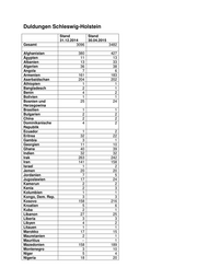 Duldungen Stadt Flensburg Stand Stand 31.12.2014 30.04.2015 Gesamt 80 95 Afghanistan 18 22 Algerien 2 2 Armenien 2 2 Aserbaidschan 1 1 Bosnien und 2 2 Herzegowina Bulgarien 1 1 Eritrea 2 1 Ghana 1 2 Irak 16 17 Iran 5 6 Jemen 1 Kosovo 6 8 Kroatien 2 2 Libyen 1 Marokko 4 3 Pakistan 1 1 Polen 2 2 Russ. Föderation 1 3 Serbien 4 4 Somalia 1 4 Syrien 1 3 Türkei 2 2 ungeklärt 5 6