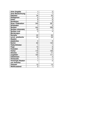 ohne Angabe 1 2 ohne Bezeichnung 1 1 Pakistan 34 33 Philippinen 2 2 Polen 9 9 Rumänien 3 3 Russ. Föderation 345 367 Schweden 1 2 Serbien 442 566 Serbien (ehemals) 10 7 Serbien und 3 4 Montenegro Somalia 22 44 sonst. asiatische 34 29 Staaten staatenlos 4 5 Syrien 82 134 Tadschikistan 1 1 Togo 10 9 Tunesien 6 8 Türkei 116 106 Ukraine 10 11 ungeklärt 100 111 Usbekistan 3 3 Venezuela 1 1 Vereinigte Staaten 1 2 von Amerika Vietnam 12 13 Weißrussland 2 1