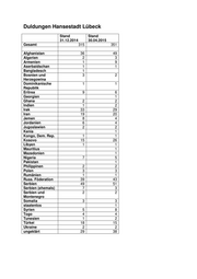 Duldungen Hansestadt Lübeck Stand Stand 31.12.2014 30.04.2015 Gesamt 315 351 Afghanistan 36 49 Algerien 2 3 Armenien 1 9 Aserbaidschan 1 1 Bangladesch 1 Bosnien und 3 2 Herzegowina Dominikanische 1 1 Republik Eritrea 9 6 Georgien 1 Ghana 2 2 Indien 1 2 Irak 33 29 Iran 19 20 Jemen 8 4 Jordanien 6 4 Jugoslawien 2 2 Kenia 1 Kongo, Dem. Rep. 1 1 Kosovo 15 26 Libyen 1 1 Mauritius 1 Mazedonien 1 Nigeria 7 5 Pakistan 1 Philippinen 2 2 Polen 3 3 Rumänien 1 1 Russ. Föderation 39 43 Serbien 49 51 Serbien (ehemals) 7 3 Serbien und 2 2 Montenegro Somalia 3 3 staatenlos 1 Syrien 5 8 Togo 4 4 Tunesien 1 2 Türkei 18 15 Ukraine 2 2 ungeklärt 29 38