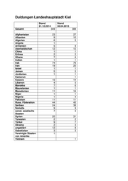 Duldungen Landeshauptstadt Kiel Stand Stand 31.12.2014 30.04.2015 Gesamt 349 388 Afghanistan 23 27 Albanien 9 10 Algerien 6 5 Angola 1 Armenien 5 9 Aserbaidschan 12 12 China 1 1 Eritrea 2 2 Ghana 7 6 Indien 1 1 Irak 74 76 Iran 19 20 Israel 1 1 Jemen 5 5 Jordanien 1 1 Kamerun 1 Kosovo 10 14 Libanon 4 5 Marokko 7 6 Mauretanien 1 1 Mazedonien 11 16 Niger 1 1 Nigeria 1 4 Pakistan 11 11 Russ. Föderation 44 43 Serbien 24 38 Somalia 9 9 sonst. asiatische 7 3 Staaten Syrien 20 31 Tunesien 2 2 Türkei 9 7 Ukraine 2 3 ungeklärt 12 8 Usbekistan 3 3 Vereinigte Staaten 1 von Amerika Vietnam 1