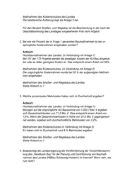 Maßnahmen des Küstenschutzes des Landes Die tabellarische Auflistung liegt als Anlage 2 bei. Für den Bereich Straßen- und Wegebau ist die Beantwortung in der nach der Geschäftsordnung des Landtages vorgesehenen Frist nicht möglich. 2. Bei wie viel Prozent der in Frage 1 genannten Baumaßnahmen ist der ur- sprüngliche Kostenrahmen eingehalten worden? Antwort: Hochbaumaßnahmen des Landes: (in Verbindung mit Anlage 1) Bei 101 der 173 Projekte werden die jeweiligen Kosten der AU-Bau eingehal- ten oder es fallen geringere Kosten an. Das entspricht einem Anteil von 58%. Maßnahmen des Küstenschutzes: (in Verbindung mit Anlage 2) Der ursprüngliche Kostenrahmen wurde bei 35 % der aufgezeigten Maßnah- men eingehalten. Maßnahmen des Straßen- und Wegebaus des Landes Siehe Antwort zu 1 3. Welche prozentualen Mehrkosten haben sich im Durchschnitt ergeben? Antwort: Hochbaumaßnahmen des Landes: (in Verbindung mit Anlage 1): Bezogen auf die ursprüngliche AU-Bausumme von 1.022,7 Mio. € ergeben sich Gesamtmehrkosten von 71,2 Mio. €. Dies entspricht einem Anteil von 7,0%. Wenn die Gesamtminderkosten in Höhe von 37,6 Mio. € gegengerech- net werden, ergeben sich durchschnittliche Mehrkosten von 3,2%. Maßnahmen des Küstenschutzes (in Verbindung mit Anlage 2) Es haben sich im Durchschnitt rund 8 % Mehrkosten ergeben. Maßnahmen des Straßen- und Wegebaus des Landes Siehe Antwort zu 1 4. Beabsichtigt die Landesregierung die Veröffentlichung der Vorschriftensamm- lung des „Handbuch Bau“ für die Planung und Durchführung von Baumaß- nahmen des Landes (HBBau Schleswig-Holstein) im Internet? Wenn nein, wa- rum nicht?