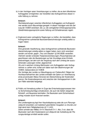 Verjährungsfrist im Vertrag vereinbart, so beträgt sie für Bauwerke 4 Jahre, für andere Werke, deren Erfolg in der Herstellung, Wartung oder Veränderung ei- ner Sache besteht, und für die vom Feuer berührten Teile von Feuerungsan- lagen 2 Jahre. Die Wahrnehmung dieser Ansprüche für Baumaßnahmen des Landes wird durch die GMSH (Gebäudemanagement Schleswig-Holstein AöR) sicherge- stellt. Für den Bereich der Ver- und Entsorgung, werden ebenfalls durch die GMSH im Regelfall innerhalb von zwei Jahren, die Funktionsfähigkeit und Einstell- sowie Regelungsbedarfe der fertiggestellten Baumaßnahme im Echtbetrieb mit den Planungsparametern abgeglichen, kontrolliert und ggf. nachgeführt. Im ZGB (Zentrales Grundvermögen für Behördenunterbringung des Landes SH), das vollständig von der GMSH bewirtschaftet wird, werden die Ergebnisse über die Fertigstellung einer Baumaßnahme hinaus, fortlaufend dokumentiert und dem FM zur Verfügung gestellt. Eine Nachschau in finanzieller Hinsicht findet nach der Rechnungslegung ei- ner abgeschlossenen Baumaßnahme als Abgleich zwischen den veranschlag- ten/genehmigten Baukosten und Baunebenkosten mit den tatsächlichen Aus- gaben in der GMSH statt. 12. Wie steht die Landesregierung zu einer Übernahme der folgenden Vorschlä- ge des Bundes der Steuerzahler und wie begründet sie ihre Position dazu (bit- te einzeln beantworten): a) Bei der Beauftragung Dritter durch die öffentliche Hand müssten die für die Bauverwaltungen geltenden Baudurchführungs- und Vergaberichtlinien und -handbücher vertraglich verbindlich vereinbart werden. Antwort: Hochbaumaßnahmen des Landes: Die öffentliche Hand hat aufgrund der Gesetzgebundenheit der Verwaltung bei der Durchführung von Vergaben zur Bauauftragserteilung die einschlä- gigen rechtlichen Bestimmungen, wie z. B. das Gesetz gegen Wettbe- werbsbeschränkungen (GWB), das Gesetz über die Sicherung von Tarif- treue und Sozialstandards sowie fairen Wettbewerb bei der vergabeöffent- licher Aufträge (TTG), die Vergabeverordnung (VgV), die Vergabe- und Vertragsordnung für Bauleistungen (VOB), einzuhalten. Außerdem sind die Baudienststellen angewiesen, die Anforderungen des Vergabehandbuches zu erfüllen und sämtliche danach den Vertragspartnern aufzuerlegenden Verpflichtungen für die Baudurchführung mit den Firmen zu vereinbaren.