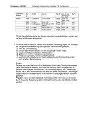 Drucksache 18/1786 Schleswig-Holsteinischer Landtag - 18. Wahlperiode Geschäfts- Zu Zu b) Zu c) Zu d) Zu e) (§§ Zu f) bereich a) beziehen sich aufs StGB) Polizei 2009 LG Itzehoe 1 KLs 22/08 Zeuge 308, 243, nein 244, 244a 2009 LG Kiel 8 Ks 4/09 Zeuge 211 nein 2010 LG Augsburg 8 Ks 200 Js 1103 Zeuge 211 nein 990/07 2010 LG Kiel 593 Js 3921/10 Zeuge 250, 226 nein 2011 LG Kiel 10 KLs 20/10 Zeuge 249 nein Für die Geschäftsbereiche der übrigen obersten Landesbehörden wurden kei- ne Sperrerklärungen abgegeben. 2. Zu den in den letzten fünf Jahren nicht erteilten Genehmigungen zur Aussage als Zeuge wird um Mitteilung der folgenden Informationen gebeten: a) Jahr der Entscheidung b) Gericht oder andere Stelle, vor der ausgesagt werden sollte c) gegebenenfalls gerichtliches Aktenzeichen d) Zweck der Aussage (Verfahrensgegenstand) e) gerichtliche Feststellung der Rechtmäßigkeit oder Rechtswidrigkeit der nicht erteilten Genehmigung Antwort: Es geht um einen dienstrechtlich geregelten Schutz des Dienstgeheimnisses. Jeder Beamte/jede Beamtin, und über das Arbeits- und Tarifrecht auch je- der/jede Beschäftigte, fällt darunter. Die Entscheidung trifft der Dienstvorge- setzte, sie ist also dezentralisiert und wird von einer Vielzahl von Dienstvorge- setzten aller Geschäftsbereiche in Ministerien und nachgeordneten Behörden getroffen. Angaben hierzu werden statistisch nicht erfasst. Die Informationen müssten durch manuelle Auswertung aller in Betracht kommenden Verfahren ermittelt werden.