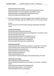Drucksache 18/5002 Schleswig-Holsteinischer Landtag - 18. Wahlperiode Masterstudiengang Green Energy Bachelorstudiengang Immobilienwirtschaft Real Estate Business Studies Masterstudiengang Tourismusmanagement (weiterbildend, online) Bachelorstudiengang Umweltgerechte Gebäudesystemtechnik Bachelorstudiengang Wirtschaftspsychologie 4. Welche Studiengänge sind seit 2010 eingestellt oder grundsätzlich verändert wor- den? Welche Abschlüsse außer dem BA/MA können an FHen erworben werden? Antwort: Seit 2010 sind an den Fachhochschulen folgende Studiengänge aufgehoben worden: Hochschule Flensburg: Bachelorstudiengang Angewandte Mathematik Bachelorstudiengang Betriebswirtschaft (berufsbegleitend) in Kooperation mit der Northern Business School GmbH Bachelorstudiengang Elektrische Energiesystemtechnik Bachelorstudiengang Energie- und Umweltmanagement Bachelorstudiengang Regenerative Energietechnik Masterstudiengang Wind Engineering (weiterbildend) Fachhochschule Kiel: Masterstudiengang Wind Engineering (konsekutiv) in Kooperation mit der Hoch- schule Flensburg (die HS Flensburg führte den Studiengang alleine weiter) Masterstudiengang Wirtschaftsinformatik Masterstudiengang Informationstechnologie Masterstudiengang Elektrotechnik Masterstudiengang Mechatronik Triales Modell im Bachelorstudiengang Informationstechnologie und Internet Fachhochschule Lübeck: Diplomstudiengang Umweltingenieurwesen Diplomstudiengang Elektrotechnik-Kommunikations-, Informations- und Medien- technik Dualer Bachelorstudiengang Gesundheitswirtschaft Bachelorstudiengang Chemie- und Umwelttechnik Masterstudiengang Health Care Management 4