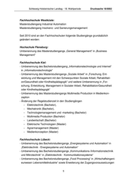 Schleswig-Holsteinischer Landtag - 18. Wahlperiode Drucksache 18/5002 Fachhochschule Westküste: Masterstudiengang Industrial Automation Masterstudiengang Insolvenz- und Sanierungsmanagement Seit 2010 sind an den Fachhochschulen folgende Studiengänge grundsätzlich geändert worden: Hochschule Flensburg: Umbenennung des Masterstudiengangs „General Management“ in „Business Management“ Fachhochschule Kiel: - Umbenennung des Bachelorstudiengang „Informationstechnologie und Internet“ in „Informationstechnologie“ - Umbenennung des Masterstudiengangs „Soziale Arbeit“ in „Forschung, Ent- wicklung und Management mit den Schwerpunkten Soziale Arbeit, Rehabilitati- on/Gesundheit oder Kindheitspädagogik“ und weitere Umbenennung in „For- schung, Entwicklung, Management in Sozialer Arbeit, Rehabilitation/Gesundheit oder Kindheitspädagogik“ - Umbenennung des Masterstudiengangs Multimedia Production in Medienkon- zeption - Änderung der Regelstudienzeit in den Studiengängen Elektrotechnik (Bachelor), Mechatronik (Bachelor), Technologiemanagement und -marketing (Bachelor) Multimedia Production (Bachelor) Landwirtschaft (Bachelor) Elektrische Technologien (Master) Agrarmanagement (Master) Medienkonzeption (Master) Fachhochschule Lübeck: - Umbenennung des Bachelorstudiengangs „Energiesysteme und Automation“ in „Elektrotechnik - Energiesysteme und Automation“ - Umbenennung des Bachelorstudiengangs „Kommunikations-/Informationstechnik und Mikrotechnik“ in „Elektrotechnik - Kommunikationssysteme“ - Umbenennung des Bachelorstudiengangs „Food Processing“ in „Wirtschaftsingeni- eurwesen Lebensmittelindustrie“ sowie Erweiterung der Zugangsvoraussetzungen 5