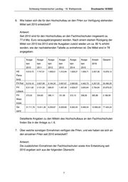 Schleswig-Holsteinischer Landtag - 18. Wahlperiode Drucksache 18/5002 6. Wie haben sich die für den Hochschulbau an den FHen zur Verfügung stehenden Mittel seit 2010 entwickelt? Antwort: Seit 2010 sind für den Hochschulbau an den Fachhochschulen insgesamt ca. 77,4 Mio. Euro verausgabt/angesetzt worden. Nach einem starken Rückgang der Mittel von 2010 bis 2013 sind die Ausgaben zuletzt wieder um ca. 80 % erhöht worden, wie der nachstehenden Tabelle zu entnehmen ist. Die Mittel sind in T€ angegeben: Ausga- Ausga- Ausga- Ausga- Ausga- Ausga- Ansatz Gesamt ben ben ben ben ben ben 2016 2010 2011 2012 2013 2014 2015 HS 4.610,73 7.747,51 1.009,51 1.312,94 1.628,37 1.009,71 2.557,36 15.876,13 Flens- burg FH Kiel 8.216,18 5.627,99 6.164,34 3.067,67 2.683,83 4.462,73 5.257,55 35.480,29 FH 8.511,82 2.101,26 689,91 1.497,49 4.638,07 3.655,84 2.784,84 23.879,23 Lübeck FH 373,03 334,60 396,11 151,58 312,13 338,26 282,88 2.188,59 West- küste Ge- 21.711,76 15.811,36 8.259,87 6.029,68 9.262,40 9.466,54 10.882,63 77.424,24 samt Detaillierte Angaben zu den Mitteln des Hochschulbaus an den Fachhochschulen finden Sie in der Anlage zu I. 6. 7. Über welche sonstigen Einnahmen verfügen die FHen, und wie haben sie sich an den einzelnen FHen seit 2010 entwickelt? Antwort: Die zusätzlichen Einnahmen der Fachhochschulen sowie ihre Entwicklung seit 2010 ergeben sich aus der folgenden Übersicht: 7