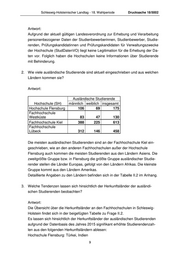 Schleswig-Holsteinischer Landtag - 18. Wahlperiode Drucksache 18/5002 Antwort: Aufgrund der aktuell gültigen Landesverordnung zur Erhebung und Verarbeitung personenbezogener Daten der Studienbewerberinnen, Studienbewerber, Studie- renden, Prüfungskandidatinnen und Prüfungskandidaten für Verwaltungszwecke der Hochschule (StudDatenVO) liegt keine Legitimation für die Erhebung der Da- ten vor. Folglich haben die Hochschulen keine Informationen über Studierende mit Behinderung. 2. Wie viele ausländische Studierende sind aktuell eingeschrieben und aus welchen Ländern kommen sie? Antwort: Ausländische Studierende Hochschule (SH) männlich weiblich insgesamt Hochschule Flensburg 106 69 175 Fachhochschule Westküste 83 47 130 Fachhochschule Kiel 388 225 613 Fachhochschule Lübeck 312 146 458 Die meisten ausländischen Studierenden sind an der Fachhochschule Kiel ein- geschrieben, wie an den anderen Fachhochschulen außer der Hochschule Flensburg auch kommen die meisten Studierenden aus den Ländern Asiens. Die zweitgrößte Gruppe bzw. in Flensburg die größte Gruppe ausländischer Studie- render stellen die Länder Europas, gefolgt von den Ländern Afrikas. Die kleinste Gruppe kommt aus den Ländern Amerikas. Detaillierte Angaben zu den Ländern befinden sich in der Tabelle II.2 im Anhang. 3. Welche Tendenzen lassen sich hinsichtlich der Herkunftsländer der ausländi- schen Studierenden beobachten? Antwort: Die Übersicht über die Herkunftsländer an den Fachhochschulen in Schleswig- Holstein findet sich in der beigefügten Tabelle zu Frage II.2. Es lassen sich hinsichtlich der Herkunftsländer der ausländischen Studierenden aufgrund der Datenbasis des Jahres 2015 signifikant erhöhte Studierendenzah- len aus den folgenden Herkunftsländern ablesen: Hochschule Flensburg: Türkei, Indien 9