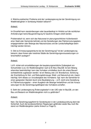 Schleswig-Holsteinischer Landtag - 18. Wahlperiode Drucksache 18/4992 4. Welche praktischen Probleme sind der Landesregierung bei der Genehmigung von Waldkindergärten in Schleswig-Holstein bekannt? Antwort: Im Einzelfall kann standortbezogen oder bauartbedingt im Hinblick auf die rechtlichen Anforderungen keine Baugenehmigung für bauliche Anlagen erteilt werden. Problematisch ist, wenn sich das Naturareal im planungsrechtlichen Außenbereich einer Stadt oder Gemeinde befindet und die Darstellungen des Flächennutzungsplans entgegenstehen oder Belange des Naturschutzes und der Landschaftspflege beein- trächtigt werden können. 5. Gibt es Ermessungsspielräume bei der Genehmigung? Ist der Landesregierung bekannt, dass Kreise oder kreisfreie Städte die Genehmigungsvoraussetzungen un- terschiedlich auslegen? Antwort: I.d.R. richtet sich einzelfallbezogen die bauplanungsrechtliche Zulässigkeit von Schutzhütten (o.ä.) für Waldkindergärten nach § 35 Abs.2 BauGB. Ist kein Belang erkennbar beeinträchtigt, kann das Vorhaben unmittelbar durch die untere Bauauf- sichtsbehörde zugelassen werden. Ist ein Belang (wie z.B. Brandschutz, Sicherung der Erschließung für Not- und Rettungsfahrzeuge, Wald- und Naturschutz etc.) beein- trächtigt, führt dieses zur Unzulässigkeit des Vorhabens. Ggf. kann die Gemeinde für einen geeigneten Standort durch eine Bauleitplanung – i.d.R. reicht eine Darstellung im Flächennutzungsplan – einen Ausgleich der Belange herbeiführen und die Voraus- setzungen für die Genehmigungsfähigkeit des Vorhabens schaffen. 6. Sieht die Landesregierung Änderungsbedarf in der LBO oder im BauGB, um den Bau und Bestand von Waldkindergärten nicht zu gefährden? Antwort: Nein. Die Genehmigungspflicht für Sonderbauten in der Landesbauordnung dient der Sicherheit. Auch die bundesrechtlichen Regelungen gefährden weder Bau noch Be- stand von Waldkindergärten (siehe Antwort zu Frage 5). 3