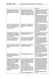 Drucksache 19/991 Schleswig-Holsteinischer Landtag - 19. Wahlperiode zutragen. Straßenrechtliche Anbaube- Straßenrechtliche Anbaube- Anbaubeschränkungszonen an schränkungszonen und plan- schränkungszonen an Bundes-, Autobahnen wurden heraus- verfestigte Straßenbauplanun- Landes- und Kreisstraßen und genommen und zum Abwä- gen vordringlich von Bund und Land gungskriterium heruntergestuft verfolgte Straßenbauplanungen (s.u.). Berücksichtigt werden jetzt die im Bundesverkehrswegeplan 2030 und Bedarfsplan des Bundes benannten Projekte, Ausbaumaßnahmen vorhan- dener Straßen des Bundes sowie Neubaumaßnahmen des Landes. Deiche und Küstenschutzanla- Landesschutz- und Regional- Mittel- und Binnendeiche wa- gen mit einem Abstand von deiche mit einem Abstand von ren bisher unter diesem Krite- 100 m zu Landesschutz- und 100 m rium mit erfasst, sind aber jetzt Regionaldeichen eigenes Abwägungskriterium (s.u.), weil hier im Einzelfall geringere Abstände ausrei- chend sind. Vorranggebiete für die Roh- entfällt als Tabukriterium, wird Einzelfallbetrachtung wird dem stoffsicherung / Vorranggebie- Abwägungskriterium, s.u. Belang besser gerecht und te für den Abbau oberflächen- ermöglicht Ermessensspiel- naher Rohstoffe räume. 3 bzw. 5 km Abstand zum 3.000 m bzw. 5.000 m Abstand Anpassung der Tabuabgren- Danewerk / Haithabu (vorge- zur archäologischen Welterbe- zung ohne Beeinträchtigung sehenes Weltkulturerbe) stätte Danewerk / Haithabu des Kulturerbes aufgrund einer durchgeführten Sichtfeld- studie des Archäologischen Landesamtes. Nordfriesische Inseln und Hal- Nordfriesische Halligen außer- Nordfriesische Inseln werden ligen außerhalb des National- halb des Nationalparks nicht mehr als weiches parks Tabukriterium, sondern als Abwägungskriterium berück- sichtigt, um die jeweiligen Ein- zelfälle sowie den Altanlagen- bestand besser berücksichti- gen zu können. Schwerpunktbereiche des Jetzt Abwägungskriterium, s.u. Differenziertere Betrachtung, Biotopverbundsystems gem. § um mehr Abwägungsspielräu- 21 BNatSchG me zu ermöglichen. Bedeutsame Nahrungsgebiete a) neues Tabukriterium: Interna- Um den Anforderungen des für Gänse (ohne Graugänse tional bedeutsame Nahrungs- Artenschutzes und der beson- und Neozoen) und Schwäne gebiete, Schlafplätze und Flug- deren Bedeutung Schleswig- (Zwerg- und Singschwäne) korridore von Zwergschwänen Holsteins für die Erhaltung der Arten gerecht zu werden, wer- außerhalb von EU- außerhalb von EU- den neben den international Vogelschutzgebieten sowie Vogelschutzgebieten bedeutsamen Nahrungsflä- 1.000 m Abstand um Kolonien b) neues Tabukriterium: chen und Schlafplätzen auch von Trauerseeschwalben und 1.000 m Abstand um Kolonien die Flugkorridore zwischen 3.000 m Abstand um die Lach- von Trauerseeschwalben und diesen weiterhin als weiches seeschwalben-Kolonie bei 3.000 m Abstand um die Lach- Ausschlusskriterium aufge- Neufeld seeschwalben-Kolonie bei Neu- nommen. feld Bezüglich Abwägungskriteri- c) neues Abwägungskriterium: um: s. u. 2