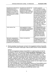 Drucksache 19/991 Schleswig-Holsteinischer Landtag - 19. Wahlperiode Eine Berechnung, welche Auswirkungen innerhalb der Potenzialfläche jedes ein- zelne Abwägungskriterium für die Vorranggebietskulisse hatte, ist nicht möglich, weil es sich bei den Abwägungsentscheidungen immer um Einzelfälle im Zu- sammenspiel aller auf der jeweiligen Fläche relevanten Abwägungskriterien han- delt. Gewinn Potenzial- Verlust Potenzial- Weiches Tabukriterium fläche in ha* fläche in ha* In den Regionalplänen festgelegte Siedlungsach- sen, besondere Siedlungsräume und Entwicklungs- - 326 und Entlastungsorte. Straßenrechtliche Anbaubeschränkungszonen an Bundes-, Landes- und Kreisstraßen und vordring- 496 - lich von Bund und Land verfolgte Straßenbaupla- nungen Landesschutz- und Regionaldeiche mit einem Ab- 0 0 stand von 100 m Vorranggebiete für die Rohstoffsicherung / Vor- ranggebiete für den Abbau oberflächennaher Roh- 432 - stoffe 3.000 m bzw. 5.000 m Abstand zur archäologischen - 245 Welterbestätte Danewerk / Haithabu Nordfriesische Halligen außerhalb des National- 668 - parks Schwerpunktbereiche des Biotopverbundsystems 6.783 - gem. § 21 BNatSchG International bedeutsame Nahrungsgebiete, Schlafplätze und Flugkorridore von Zwergschwänen außerhalb von EU-Vogelschutzgebieten - 4.027 1.000 m Abstand um Kolonien von Trauersee- schwalben und 3.000 m Abstand um die Lachsee- schwalben-Kolonie bei Neufeld 3.000 m Abstand um landesweit bedeutsame 1.076 - Schlafgewässer der Kraniche Küstenstreifen an der Nordsee und auf Fehmarn 156 - Umgebungsbereich von 200 m bei Naturschutzge- bieten und Gebieten, die nach § 22 BNatSchG in Verbindung mit § 12 Abs. 3 LNatSchG als Natur- 1.494 - schutzgebiet einstweilig sichergestellt sind, sowie FFH-Gebieten und Umgebungsbereich von 300 m um den Nationalpark *bei den ha-Angaben handelt es sich um Näherungswerte 3. Welche neu vorgesehenen Vorranggebiete sind durch die Änderung der Entwürfe hinzugekommen, die im ersten Entwurf nicht vorgesehen waren? Welche sind komplett oder teilweise entfallen? Antwort: Im zweiten Planentwurf wurden 63 Vorranggebiete in einer Größenordnung von 6