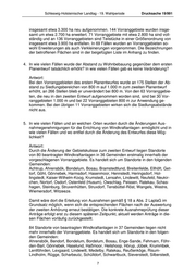 Schleswig-Holsteinischer Landtag - 19. Wahlperiode Drucksache 19/991 insgesamt etwa 3.300 ha neu aufgenommen. 144 Vorranggebiete wurden insge- samt um etwa 2.700 ha erweitert. 71 Vorranggebiete mit etwa 2.800 ha sind voll- ständig und an 136 Vorranggebieten sind Teilstücke in einer Größenordnung von insgesamt etwa 3.900 ha entfallen. In 69 Fällen wurden an Vorranggebieten so- wohl Erweiterungen als auch Verkleinerungen vorgenommen. Die Bezeichnungen der betroffenen Flächen sind in der beigefügten Liste im Anhang zu finden. 4. In wie vielen Fällen wurde der Abstand zu Wohnbebauung gegenüber dem ersten Planentwurf tatsächlich erhöht? In wie vielen Fällen gab es keine Veränderung? Antwort: Bei den Vorranggebieten des ersten Planentwurfes wurde an 175 Stellen der Ab- stand zu Siedlungsbereichen von 800 m auf 1.000 m zum zweiten Planentwurf erhöht, an 266 Stellen blieb er unverändert bei 800 m. Von den 63 Vorranggebie- ten, die neu in den zweiten Entwurf aufgenommen worden sind, sind bei 30 Vor- ranggebieten 1.000 m und bei 22 Vorranggebieten 800 m zur Anwendung ge- kommen. Bei den übrigen 11 Vorranggebieten wirken sich die Siedlungsabstände nicht aus. 5. In wie vielen Fällen und an welchen Orten wurden durch die Änderungen Aus- nahmegenehmigungen für die Errichtung von Windkraftanlagen ermöglicht und in wie vielen Fällen und wo entfiel durch die Änderung des Entwurfes diese Mög- lichkeit? Antwort: Durch die Änderung der Gebietskulisse zum zweiten Entwurf liegen Standorte von 80 beantragten Windkraftanlagen in 36 Gemeinden erstmalig innerhalb der vorgeschlagenen Vorranggebiete. Es handelt sich um Standorte in den folgenden Gemeinden: Achtrup, Ahrensbök, Bondelum, Bosau, Bramstedtlund, Breitenfelde, Ellhöft, Get- torf, Göhl, Gönnebek, Harmsdorf, Hasenmoor, Hennstedt, Heringsdorf, Hol- lingstedt, Kaiser-Wilhelm-Koog, Krumstedt, Lensahn, Lindewitt, Neufeld, Neukir- chen, Nortorf, Osdorf, Ostenfeld (Husum), Owschlag, Peissen, Ratekau, Schas- hagen, Steinburg, Struvenhütten, Struxdorf, Tensbüttel-Röst, Wangels, Westre, Wiemersdorf, Witzeeze. Damit wäre dort die Erteilung von Ausnahmen gemäß § 18 a Abs. 2 LaplaG im Grundsatz möglich, wenn sich die entsprechenden Flächen nach der Auswertung der zweiten Anhörung erneut bestätigen. Die konkrete Ausnahmeprüfung dieser Anträge erfolgt erst zu diesem späteren Zeitpunkt, aktuell werden Anträge in die- sen Flächen vorläufig zurückgestellt. 84 Standorte von beantragten Windkraftanlagen in 37 Gemeinden liegen nicht mehr innerhalb der Vorranggebiete. Es handelt sich um Standorte in den folgen- den Gemeinden: Ahrensbök, Bendorf, Bondelum, Bordelum, Bosau, Enge-Sande, Fehmarn, Föhr- den-Barl, Gönnebek, Haselund, Haßmoor, Heilshoop, Hörup, Jübek, Krummbek, Lentföhrden, Lexgaard, Lindewitt, Medelby, Ratekau, Reußenköge, Risum- Lindholm, Rügge, Scharbeutz, Schülldorf, Schwartbuck, Sieverstedt, Silberstedt, 7