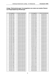 Schleswig-Holsteinischer Landtag - 19. Wahlperiode Drucksache 19/991 Anlage: Flächenänderungen Vorranggebiete vom ersten zum zweiten Planent- wurf Regionalplanung Windenergie Vorranggebiet Art der Veränderung Vorranggebiet Art der Veränderung PR1_NFL_002 Flächenerweiterung PR1_NFL_002 Verkleinerung PR1_NFL_014 Flächenerweiterung PR1_NFL_014 Verkleinerung PR1_NFL_026 Flächenerweiterung PR1_NFL_026 Verkleinerung PR1_NFL_028 Flächenerweiterung PR1_NFL_039 Verkleinerung PR1_NFL_031 Flächenerweiterung PR1_NFL_045 Verkleinerung PR1_NFL_032 Flächenerweiterung PR1_NFL_047 Verkleinerung PR1_NFL_036 Flächenerweiterung PR1_NFL_049 Verkleinerung PR1_NFL_038 Flächenerweiterung PR1_NFL_056 Verkleinerung PR1_NFL_039 Flächenerweiterung PR1_NFL_060 Verkleinerung PR1_NFL_043 Flächenerweiterung PR1_NFL_069 Verkleinerung PR1_NFL_046 Flächenerweiterung PR1_NFL_074 Verkleinerung PR1_NFL_048 Flächenerweiterung PR1_NFL_087 Verkleinerung PR1_NFL_056 Flächenerweiterung PR1_NFL_089 Verkleinerung PR1_NFL_057 Flächenerweiterung PR1_NFL_090 Verkleinerung PR1_NFL_060 Flächenerweiterung PR1_NFL_091 Verkleinerung PR1_NFL_062 Flächenerweiterung PR1_NFL_094 Verkleinerung PR1_NFL_072 Flächenerweiterung PR1_NFL_096 Verkleinerung PR1_NFL_084 Flächenerweiterung PR1_NFL_104 Verkleinerung PR1_NFL_085 Flächenerweiterung PR1_NFL_107 Verkleinerung PR1_NFL_089 Flächenerweiterung PR1_NFL_113 Verkleinerung PR1_NFL_090 Flächenerweiterung PR1_NFL_115 Verkleinerung PR1_NFL_095 Flächenerweiterung PR1_NFL_118 Verkleinerung PR1_NFL_102 Flächenerweiterung PR1_NFL_120 Verkleinerung PR1_NFL_102 Flächenerweiterung PR1_NFL_122 Verkleinerung PR1_NFL_113 Flächenerweiterung PR1_NFL_125 Verkleinerung PR1_NFL_118 Flächenerweiterung PR1_SLF_003 Verkleinerung PR1_NFL_122 Flächenerweiterung PR1_SLF_011 Verkleinerung PR1_NFL_125 Flächenerweiterung PR1_SLF_034 Verkleinerung PR1_NFL_301 Flächenerweiterung PR1_SLF_040 Verkleinerung PR1_NFL_302 Flächenerweiterung PR1_SLF_043 Verkleinerung PR1_NFL_309 Flächenerweiterung PR1_SLF_065 Verkleinerung PR1_SLF_003 Flächenerweiterung PR1_SLF_074 Verkleinerung PR1_SLF_031 Flächenerweiterung PR1_SLF_078 Verkleinerung PR1_SLF_058 Flächenerweiterung PR1_SLF_080 Verkleinerung PR1_SLF_059 Flächenerweiterung PR1_SLF_102 Verkleinerung PR1_SLF_065 Flächenerweiterung PR1_SLF_105 Verkleinerung PR1_SLF_066 Flächenerweiterung PR1_SLF_109 Verkleinerung PR1_SLF_075 Flächenerweiterung PR1_SLF_112 Verkleinerung PR1_SLF_081 Flächenerweiterung PR1_SLF_114 Verkleinerung PR1_SLF_102 Flächenerweiterung PR2_PLO_001 Verkleinerung PR1_SLF_109 Flächenerweiterung PR2_PLO_002 Verkleinerung PR1_SLF_112 Flächenerweiterung PR2_PLO_032 Verkleinerung PR1_SLF_114 Flächenerweiterung PR2_PLO_303 Verkleinerung 9