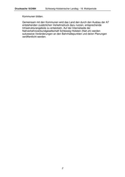 SCHLESWIG-HOLSTEINISCHER LANDTAG Drucksache 18/2484 18. Wahlperiode 14-12-03 Kleine Anfrage des Abgeordneten Volker Dornquast (CDU) und Antwort der Landesregierung – Ministerium für Wirtschaft, Arbeit, Verkehr und Technologie Park & Ride-Konzept an der A 7 II Vorbemerkung des Fragestellers: Laut meiner kleinen Anfrage vom 16.06.2014 (Drucksache 18/1958) wollte die landesweite Verkehrsservicegesellschaft MBH (LVS SH) ein Park & Ride-Konzept dem Wirtschaftsministerium (MWAVT) nach den Sommerferien vorgelegt werden. 1. Hat die LVS dem MWAVT das Konzept vorgelegt? Falls ja, wann? 2. Wann ist mit der Vorlage dieses Konzeptes angesichts der nun begonnenen Baumaßnahmen auf der A7 zu rechnen? 3. Welche Kommunen wurden bis heute in die Erstellung des Konzeptes eingebunden? Die Fragen 1 bis 3 werden wegen ihres Sachzusammenhangs zusammen be- antwortet: Die Landesweite Nahverkehrsgesellschaft Schleswig-Holstein (LVS) stimmt derzeit mit den Kommunen eine Darstellung über die heutige Auslastung, die Ausweitungsmöglichkeiten sowie den Rahmenbedingungen für die Planung, Finanzierung und Umsetzung der Park&Ride-Anlagen auch im Zusammen- hang mit dem Ausbau der A7 ab. Wie bereits in der Antwort der Landesregierung auf die Kleine Anfrage vom 16.06.2014 (Drs.: 18/1958) dargelegt, wird es keine fixe Liste mit Standorten für den Ausbau von Park&Ride-Anlagen, vielmehr soll die Abstimmung Grundlage für die nachfolgende Entwicklung von Park&Ride-Vorhaben in den