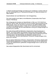 Drucksache 19/1499 Schleswig-Holsteinischer Landtag - 19. Wahlperiode 3. Welche Anmeldungen/Anträge auf Förderung für Investitionen in welcher Höhe lie- gen der Landesregierung von Frauenfacheinrichtungen vor? (bitte die einzelnen An- träge auflisten) Derzeit befinden sich zwei Maßnahmen in der Antragsprüfung. Zum einen handelt es sich dabei um die Maßnahme „Ersatzneubau eines Frauen- hauses in Rendsburg“. Dem Antrag liegt die Annahme von Gesamtkosten in Höhe von 2.102.125,00 Euro zugrunde. Hiervon sollen 785.100,00 Euro aus der Sozialen Wohnraumförderung ge- fördert worden, davon 135.100,00 Euro als Zuschuss. Aus IMPULS-Mitteln sollen 714.038,00 Euro gefördert werden. In Höhe von 511.720,00 Euro sind kommunale Zuschüsse veranschlagt. Mit einer abschließenden Prüfung der Antragsunterlagen ist bis Ende Juni zu rechnen. Der zweite Antrag betrifft die Maßnahme „Ersatzneubau eines Frauenhauses in Itzehoe“. Dort wurde lediglich eine teilweise Förderung aus IMPULS-Mitteln bean- tragt. Auf eine Förderung aus Mitteln aus der Sozialen Wohnraumförderung soll dort verzichtet werden. Die Gesamtkosten der Maßnahme belaufen sich auf 1.912.768,00 Euro. Mit einer abschließenden Prüfung der Antragsunterlagen ist bis Ende Juli zu rechnen. Bei vier weiteren Maßnahmen (Elmshorn, Schwarzenbek, Ahrensburg, Wedel) laufen konkrete Beratungsgespräche zur möglichen Bezuschussung und zum Maßnahmen- umfang. Mit entsprechenden qualifizierten Antragsunterlagen wird im Laufe des Jah- res gerechnet. Zwei weitere Erstgespräche (Kiel, Neumünster) sind für Juli terminiert. 2