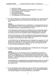 Drucksache 18/3276 Schleswig-Holsteinischer Landtag - 18. Wahlperiode • Juristinnen/Juristen, • Allgemeiner Verwaltungsdienst (Laufbahngruppen 1.2 und 2.1) • Dipl. Pädagoginnen/Dipl. Pädagogen, • Sozialwissenschaftler, • Politologinnen/Politologen, • Sozialpädagoginnen/Sozialpädagogen 3. Wie viele Einrichtungen und Fälle betreut jeder Mitarbeiter bzw. jede Mitarbeiterin im Landesjugendamt? Wie hat sich die Zahl in den letzten zehn Jahren verän- dert? Antwort: Die Aufgaben der Mitarbeiterinnen und Mitarbeiter im Landesjugendamt sind viel- fältig und betreffen nicht nur Einrichtungen und Fälle. Dazu gehört z.B. auch die Geschäftsführung des Landesjugendhilfeausschusses. In der Heimaufsicht haben bisher sechs Mitarbeiterinnen und Mitarbeiter jeweils ca. 300 Einrichtungen einschließlich der Kindertagesstätten betreut. Seit Mitte Juni werden sie durch zwei zusätzliche Diplom-Sozialpädagogen unterstützt. Nach der Sommerpause und den vorübergehenden Vertretungssituationen ist ei- ne strukturelle Neuverteilung mit dann insgesamt 8 Mitarbeiterinnen und Mitarbei- tern geplant. Eine Erfassung von Fällen erfolgt nicht. Im Jahr 2005 waren vier Mitarbeiterinnen und Mitarbeiter für insgesamt ca. 1420 Einrichtungen zuständig, also mehr als 350 pro Person. Diese Personalsituation blieb bis zur Aufstockung um zwei Stellen im Jahr 2013 bei steigender Anzahl von Einrichtungen grundsätzlich unverändert. 4. In welchem Umfang nehmen Mitarbeiterinnen und Mitarbeiter des Landesjugend- amtes an Fortbildungen und Schulungen teil? Antwort: Den Mitarbeiterinnen und Mitarbeitern steht ein breitgefächertes Angebot zur fachlichen Fortbildung bzw. zur Vertiefung persönlicher Kompetenzen zur Verfü- gung. Von den Möglichkeiten der Inanspruchnahme externer wie interner Fortbil- dung wird – unter Berücksichtigung der dienstlichen Verpflichtungen – regelmäßig Gebrauch gemacht. Die Mitarbeiterinnen und Mitarbeiter des Landesjugendamtes haben im Jahr 2014 an 27 verschiedenen Fortbildungsveranstaltungen mit insgesamt 69 Seminarta- gen teilgenommen. 5. Ist die Landesregierung der Auffassung, dass der Bereich des Landesjugendam- tes derzeit adäquat mit Personal ausgestattet ist, um die eingehenden Aufgaben und Aufträge fristgerecht und fachlich begründet zu bearbeiten? 2