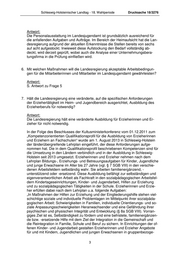 Schleswig-Holsteinischer Landtag - 18. Wahlperiode Drucksache 18/3276 Antwort: Die Personalausstattung im Landesjugendamt ist grundsätzlich ausreichend für die anfallenden Aufgaben und Aufträge. Im Bereich der Heimaufsicht hat die Lan- desregierung aufgrund der aktuellen Erkenntnisse die Stellen bereits von sechs auf acht aufgestockt. Inwieweit diese Aufstockung den Bedarf vollständig ab- deckt, wird derzeit geprüft, wobei auch die Analyse einer Unternehmungsbera- tungsfirma in die Prüfung einfließen wird. 6. Mit welchen Maßnahmen will die Landesregierung akzeptable Arbeitsbedingun- gen für die Mitarbeiterinnen und Mitarbeiter im Landesjugendamt gewährleisten? Antwort: S. Antwort zu Frage 5 7. Hält die Landesregierung eine veränderte, auf die spezifischen Anforderungen der Erziehertätigkeit im Heim- und Jugendbereich ausgerichtet, Ausbildung des Erzieherberufs für notwendig? Antwort: Die Landesregierung hält eine veränderte Ausbildung für Erzieherinnen und Er- zieher für nicht notwendig. In der Folge des Beschlusses der Kultusministerkonferenz vom 01.12.2011 zum „Kompetenzorientierten Qualifikationsprofil für die Ausbildung von Erzieherinnen und Erziehern an Fachschulen“ wurde am 1. August 2013 in Schleswig-Holstein der länderübergreifende Lehrplan eingeführt, der diese Anforderungen aufge- nommen hat. Die in dem Qualifikationsprofil beschriebenen Kompetenzen sind für die Umsetzung in den Ländern verbindlich und in der Ausbildung in Schleswig- Holstein seit 2013 umgesetzt. Erzieherinnen und Erzieher nehmen nach dem Lehrplan Bildungs-, Erziehungs- und Betreuungsaufgaben für Kinder, Jugendliche und junge Erwachsene im Alter bis 27 Jahre (vgl. § 7 SGB VIII) in den verschie- denen Arbeitsfeldern selbständig wahr. Sie arbeiten familienergänzend, - unterstützend oder -ersetzend. Diese Ausbildung befähigt zur selbständigen und eigenverantwortlichen Arbeit als Fachkraft in den sozialpädagogischen Arbeitsfel- dern Kindertageseinrichtungen, Kinder- und Jugendarbeit, Hilfen zur Erziehung und zu sozialpädagogischen Tätigkeiten in der Schule. Erzieherinnen und Erzie- her erfüllen dabei nach dem Lehrplan u.a. folgende Aufgaben: „In Maßnahmen der Hilfen zur Erziehung und der Eingliederungshilfe stehen viel- schichtige soziale und individuelle Problemlagen im Mittelpunkt ihrer sozialpäda- gogischen Arbeit: Schwierigkeiten in Familien, individuelle Orientierungs- und so- ziale Anpassungsschwierigkeiten Heranwachsender und eine Gefährdung ihrer psychischen und physischen Integrität und Entwicklung (§ 8a SGB VIII). Vorran- giges Ziel ist es, Selbständigkeit zu fördern und eine befristete, familienergänzen- de bzw. -ersetzende Hilfe mit dem Ziel der Integration in die Gemeinschaft und die Reintegration in Familie, Schule und Beruf zu sichern. In Einrichtungen der of- fenen Kinder- und Jugendarbeit gestalten Erzieherinnen und Erzieher Angebote für und mit Kindern, Jugendlichen und jungen Erwachsenen in gruppenbezoge- 3