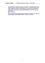 Drucksache 18/5383 Schleswig-Holsteinischer Landtag - 18. Wahlperiode Die gewünschten Informationen sind in der aktuellen Veröffentlichung „Erneu- erbare Energien in Zahlen für Schleswig-Holstein - Versorgungsbeitrag in den Jahren 2006-2015, Ausbauszenarien Strom und Wärme bis zum Jahr 2030, Treibhausgasminderung und wirtschaftliche Effekte“ vom 24. März 2017 zu finden unter http://www.schleswig- hol- stein.de/DE/Schwerpunkte/Energiewende/Daten/pdf/EE_Bilanz_2015.pdf?__blob=publication File&v=6 Kapitel D „Wirtschaftliche Effekte“, Seite 9 und Seite 36. 4
