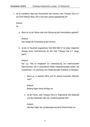 Drucksache 18/5419 Schleswig-Holsteinischer Landtag - 18. Wahlperiode 1. Ist es zutreffend, dass das Vereinsheim des Vereins „Inter Türkspor Kiel e.V.“ am Erich-Kästner-Weg 100 in Kiel stark sanierungsbedürftig ist? Antwort: Ja. a. Wenn ja, ist ein Abriss oder eine Sanierung des Vereinsheims geplant? Antwort: Das obliegt der Entscheidung des Vereins. b. Ist der im Haushalt vorgesehene Titel 0402-893 01 für einen möglichen Neubau eines Vereinsheimes für den Inter Türkspor Kiel e.V. einge- plant? Antwort: Der o.g. Titel ist eingeplant zur Unterstützung von interkulturellen Sportvereinen, die in besonderem Maße Integrationsarbeit leisten, bei Investitionen, um räumliche und infrastrukturelle Probleme zu beheben. i. Wenn ja, in welcher Höhe und für welche konkreten Maßnah- men? Antwort: Bislang liegen keine Anträge vor. ii. Ist der Verein „Inter Türkspor Kiel e.V. Eigentümer des Geländes und des Gebäudes oder die Landeshauptstadt Kiel? Antwort: Hierüber liegen der Landesregierung keine Erkenntnisse vor. 2