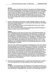 Schleswig-Holsteinischer Landtag - 18. Wahlperiode Drucksache 18/1703 Antwort: Die Landesregierung befürwortet weiterhin eine gemeinsame Pflegeausbildung. Die genauere Ausgestaltung, insbesondere hinsichtlich der fachlichen Spezialisie- rung und der Durchlässigkeit von der Helferinnenausbildung bis hin zum Pflege- studium, bedarf der weiteren Klärung auf Bund-Länder-Ebene. Die Arbeitsge- meinschaft der obersten Landesgesundheitsbehörden wird sich auf ihrer nächs- ten Sitzung mit dem Thema befassen. Es liegt ein Beschlussvorschlag vor, mit dem der Bund aufgefordert werden soll, einen entsprechenden Gesetzentwurf vorzulegen. 4. Hat die Landesregierung gemeinsam mit allen beteiligten Akteuren in der Alten- pflege eine Ausbildungskampagne zur Stärkung des Berufsbildes der Altenpflege- rin/des Altenpflegers initiiert? Wenn ja, wann? Welche Akteure wurden eingebunden und wo und in welcher Form fand die Kampagne statt? Wenn nein, warum nicht? Wann plant die Landesregierung diese Kampagne zu initiieren und wen wird sie konkret einbinden? Antwort: Die Bundesregierung, die Länder und Kommunen, die Wohlfahrtsverbände, die Fach- und Berufsverbände der Altenpflege, die Bundesagentur für Arbeit sowie die Kostenträger und Gewerkschaften haben sich auf ein umfangreiches Maß- nahmenpaket zur Fachkräftesicherung in der Altenpflege verständigt und hierzu am 13. Dezember 2012 die Vereinbarung zur „Ausbildungs- und Qualifizierungs- offensive Altenpflege“ unterzeichnet. Die Laufzeit der Offensive ist bis 31. De- zember 2015. Die Gemeinschaftsinitiative hat das Ziel, die Aus-, Fort- und Wei- terbildung in der Altenpflege zu fördern und die Attraktivität des Berufs- und Be- schäftigungsfeld zu erhöhen. Auch die am 25. Oktober 2013 gestartete Fachkräfteinitiative „Zukunft im Norden“ wird einen Beitrag zur Fachkräftesicherung in der Pflege leisten. Im Rahmen der Fachkräfteinitiative haben sich die Landesregierung, Kammern, Wirtschafts- und Kommunalverbände, Gewerkschaften, die Bundesagentur für Arbeit und die Hochschulen im Land auf Eckpunkte verständigt, wie in den kommenden Jahren der wachsende Fachkräftebedarf in Schleswig-Holstein bewältigt werden kann. Ziel der Initiative ist es, bei Unternehmen für eine mitarbeiterorientierte Personal- politik und attraktive Arbeitsbedingungen als Schlüssel zur Fachkräftebindung und -gewinnung zu werben. Im Vordergrund stehen dabei ein guter Arbeitsschutz, die betriebliche Gesundheitsfürsorge, attraktive Vergütungen sowie berufliche Qualifizierung und Weiterbildung. 5. Was hat die Landesregierung getan, um das Image der Pflegeberufe zu stärken und mehr junge Menschen für eine Ausbildung in der Pflege zu gewinnen? Antwort: Die Werbe- und Imagekampagne für Pflegeberufe des Norddeutschen Zentrums zur Weiterentwicklung der Pflege (NDZ) zielt darauf, Jugendlichen die Attraktivität einer Ausbildung zur Pflegefachkraft zu vermitteln, ihre Vorstellungen über Pfle- 3