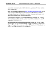 Drucksache 18/1703 Schleswig-Holsteinischer Landtag - 18. Wahlperiode geberufe zu verbessern und verstärkt männliche Jugendliche für einen solchen Beruf zu gewinnen. Unter der jugendaffinen Webadresse www.zeig-deine-pflegestaerken.de wird die Zielgruppe (junge Schulabgänger) über pflegerische Berufsbilder, mögliche Schwerpunktsetzungen in Ausbildung und Beruf, Verdienstmöglichkeiten und Spezifika der pflegerischen Berufswahl aufgeklärt. Eine kostenlose Datenbank für ausbildende Betriebe ermöglicht den Jugendli- chen, bei Interesse direkt Kontakt zu einer Gesundheits-und Kranken-, oder Al- tenpflegeschule aufzunehmen. Den Mitteilungen des Statistischen Bundesamtes für das Jahr 2012 ist zu ent- nehmen, dass sich seit dem Jahr 2000 die Zahl der männlichen Ausbildungsan- fänger in Pflegeberufen bundesweit um über 70 Prozent erhöht hat und auch ins- gesamt mehr Jugendliche diese Berufe ergreifen. 4
