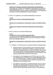 Drucksache 18/3575 Schleswig-Holsteinischer Landtag - 18. Wahlperiode Ministerium für Soziales, Gesundheit, Wissenschaft und Gleichstellung: Änderungen bei Tarifstelle 2 des allgemeinen Gebührentarifs. Es werden Ge- bührentatbestände an die zum 1. Juli 2015 in Kraft getretene Änderung der Betriebssicherheitsverordnung angepasst; Angleichung der nach Zeitaufwand bemessenen Gebührentatbestände an aktuelle Vorgaben. 2. Wenn ja, ist vorgesehen, neue Gebührentatbestände einzuführen? Antwort: Ministerium für Inneres und Bundesangelegenheiten: Ja. Ministerium für Energiewende, Landwirtschaft, Umwelt und ländliche Räume: Ja. Ministerium für Soziales, Gesundheit, Wissenschaft und Gleichstellung: Nein. 3. Wenn ja, welche und mit welcher Begründung? Antwort: Ministerium für Inneres und Bundesangelegenheiten: Ja, aufgrund der neu eingefügten Regelung zur Rückstufung eines gefährli- chen Hundes nach § 7 Abs. 4 HundeG und der darin enthaltenen Prüfungs- pflicht der zuständigen Behörde. Ministerium für Energiewende, Landwirtschaft, Umwelt und ländliche Räume: Ja. a) Tarifstelle 10: Immissionsschutz und gewerberechtliche Angelegenheiten Separate Gebühr für die Entscheidung über die Erteilung einer Ge- nehmigung nach § 4 BImSchG für Anlagen zur Nutzung der Wind- energie mit einer Gesamthöhe von mehr als 50 Metern. (Die neue Be- rechnung der Gebühr vermeidet die bisherige aufwändige Nachprü- fung und Zuordnung der Investitionskosten; eine nennenswerte Ände- rung der Gebührenhöhe ist damit nicht verbunden.) Eine Gebühr für die Feststellung der UVP-Pflicht nach § 3a UVPG. (Die Feststellung der UVP-Pflicht ist mit Verwaltungsaufwand verbun- den, der mit den bisherigen Tarifstellen finanziell nicht abgedeckt ist, sofern eine UVP-Vorprüfung nach § 3c UVPG im Anschluss an die Feststellung nicht durchgeführt wird.) Eine Gebühr für die Erteilung von Bescheinigungen nach § 27 Abs. 5 EEG 2009 (Formaldehyd-Bescheinigungen). (Der durchschnittliche Verwaltungsaufwand beträgt – ohne Vor-Ort-Kontrolle – ca. 4 – 5 Stunden. Mit der Gebührenstelle sollen Kosten und wirtschaftlicher 2