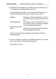 SCHLESWIG-HOLSTEINISCHER LANDTAG Drucksache 18/3804 18. Wahlperiode 2016-02-11 Kleine Anfrage des Abgeordneten Hauke Göttsch (CDU) und Antwort der Landesregierung – Minister für Energiewende, Landwirtschaft, Umwelt und ländliche Räume Wölfe in Schleswig-Holstein 1. Von welchem Wolfsbestand kann aktuell in Schleswig-Holstein ausgegangen werden? Die Wolfs-Monitoring-Ergebnisse der Länder werden jährlich durch ein Gremi- um der sogenannten „Erfahrenen Personen“ zusammengefasst und bewertet. Die letzte Sitzung dieses Gremiums fand vom 12. bis 14. Oktober 2015 statt. Für Schleswig-Holstein wurde ein Wolfsbestand von null Tieren festgestellt. Für die Ermittlung der Populationsgröße werden nur residente Tiere berück- sichtigt. Durchwandernde oder nur kurzfristig vorhandene Wölfe, sogenannte Disperser oder Floater, werden nicht berücksichtigt, können in Schleswig- Holstein aber sporadisch nachgewiesen werden. Die im Zusammenhang mit dem Nachweis residenter Wölfe anzuwendenden Kriterien sind im Rahmen eines Forschungsvorhabens des BfN durch namhafte Fachleute erarbeitet und in Form eines BfN Skriptes veröffentlicht worden und finden im Rahmen des Wolfsmonitorings bundesweit Anwendung. Voraussetzung für die Feststellung eines residenten Wolfes ist demnach, dass ein einzelner Wolf mindestens sechs Monate in einem Gebiet lebt. Solche Einzeltiere müssen durch tragfähi- ge Hinweise belegt werden.