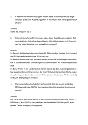 2. In welchen Berufen/Berufsgruppen wurden diese Ausbildungsverträge abge- schlossen (bitte nach Ausbildungsjahren in den letzten fünf Jahren getrennt auf- führen)? Antwort: Siehe die Anlagen 1 bis 3. 3. Welche Unternehmen/Einrichtungen haben diese Ausbildungsverträge im Zeit- raum der letzten fünf Jahre abgeschlossen (bitte differenzieren nach Unterneh- men der freien Wirtschaft und soziale Einrichtungen)? Antwort: Im Bereich der Handwerkskammern bilden 28 Bildungsträger (soziale Einrichtungen) und 31 Handwerksbetriebe (freie Wirtschaft) aus. Im Bereich der Industrie- und Handelskammern finden die Ausbildungen ausschließ- lich in außerbetrieblichen Einrichtungen in Zusammenarbeit mit Praktikumsbetrieben statt. Im Beruf Werker in der Landwirtschaft handelt es sich bei den Ausbildungsbetrieben fast ausschließlich um Unternehmen der freien Wirtschaft (landwirtschaftliche Ausbil- dungsbetriebe), in den beiden anderen Werkerberufen (Gartenbau, Pferdewirtschaft) sind auch Bildungsträger vertreten. 4. Wie wurde die Berufsschulpflicht sichergestellt (bitte die jeweils zuständige BBS/das zuständige RBZ für den jeweiligen Beruf/die jeweilige Berufsgruppe nennen)? Antwort: Die Erfüllung der Berufsschulpflicht wurde für die einzelnen Berufe nach § 66 Abs. 1 BBiG bzw. § 42m HWO an den jeweiligen Berufsbildenden Schulen gemäß anlie- gender Tabelle (Anlage 4) sichergestellt. 2