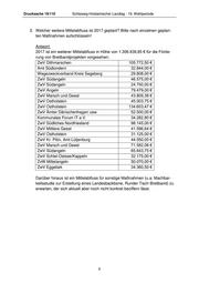 Drucksache 19/110 Schleswig-Holsteinischer Landtag - 19. Wahlperiode 3. Welcher weitere Mittelabfluss ist 2017 geplant? Bitte nach einzelnen geplan- ten Maßnahmen aufschlüsseln! Antwort: 2017 ist ein weiterer Mittelabfluss in Höhe von 1.306.839,85 € für die Förde- rung von Breitbandprojekten vorgesehen: ZwV Dithmarschen 105.772,50 € Amt Südtondern 32.844,00 € Wegezweckverband Kreis Segeberg 29.808,00 € ZwV Südangeln 46.575,00 € ZwV Südangeln 24.750,00 € ZwV Angeln 79.479,00 € ZwV Marsch und Geest 43.809,38 € ZwV Ostholstein 45.003,75 € ZwV Ostholstein 134.603,47 € ZwV Ämter Dänischenhagen usw. 52.500,00 € Kommunales Forum IT e.V. 34.282,80 € ZwV Südliches Nordfriesland 98.145,00 € ZwV Mittlere Geest 41.596,64 € ZwV Ostholstein 31.125,00 € ZwV Kr. Plön, Amt Lütjenburg 44.550,00 € ZwV Marsch und Geest 71.582,06 € ZwV Südangeln 65.643,75 € ZwV Schlei-Ostsee/Kappeln 32.175,00 € ZvW Mittelangeln 50.070,00 € ZwV Eggebek 34.360,50 € Darüber hinaus ist ein Mittelabfluss für sonstige Maßnahmen (u.a. Machbar- keitsstudie zur Erstellung eines Landesbackbone, Runder Tisch Breitband) zu erwarten, der sich aktuell aber noch nicht konkret beziffern lässt. 2