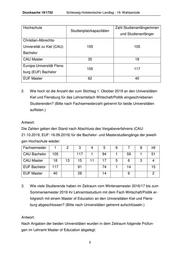 SCHLESWIG-HOLSTEINISCHER LANDTAG Drucksache 19/1752 19. Wahlperiode 2019-10-28 Kleine Anfrage der Abgeordneten Jette Waldinger-Thiering und Antwort der Landesregierung - Ministerin für Bildung, Wissenschaft und Kultur Wirtschaft/Politik an den Universitäten des Landes 1. Wie hoch sind die Studienplatzkapazitäten für Lehramtsstudierende des Faches Wirtschaft/Politik an den Universitäten Kiel und Flensburg zum Wintersemester 2019/2020? Wie hoch ist die tatsächliche Zahl der StudienanfängerInnen zum Wintersemester 2019/2020? (Bitte getrennt für beide Universitäten auflisten.) Antwort: Bezogen auf die Bachelor- und Masterstudiengänge für Lehramtsstudierende erge- ben sich für das 1. Fachsemester nach den Angaben der Hochschulen die in der Ta- belle aufgeführten Zahlen. Dabei ist zu berücksichtigen, dass die beiden Universitä- ten ihre Kapazitäten im Bachelor in den letzten Jahren aufgestockt haben und in die Masterstudiengänge im Wintersemester 2019/2020 Absolventinnen und Absolventen aus kleineren Eingangskohorten der Bachelorstudiengänge einschreiben.
