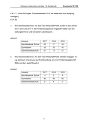 Schleswig-Holsteinischer Landtag - 19. Wahlperiode Drucksache 19/1752 CAU: 71 (Ohne Prüfungen Sommersemester 2019, da diese noch nicht endgültig vorliegen.) EUF: 53 4. Wie viele BewerberInnen mit dem Fach Wirtschaft/Politik wurden in den Jahren 2017, 2018 und 2019 in den Vorbereitungsdienst eingestellt? (Bitte nach Ein- stellungsterminen und Schularten aufschlüsseln.) Antwort: Lehramt 2017 2018 2019 Berufsbildende Schule 55 27 34 Gymnasium 25 32 42 Gemeinschaftsschule 31 15 21 5. Wie viele BewerberInnen mit dem Fach Wirtschaft/Politik erhielten hingegen im o.g. Zeitraum eine Absage auf ihre Bewerbung für einen Vorbereitungsdienst? (Bitte wie oben aufschlüsseln.) Antwort: Lehramt 2017 2018 2019 Berufsbildende Schule 11 3 8 Gymnasium 80 80 80 Gemeinschaftsschule 8 4 0 3