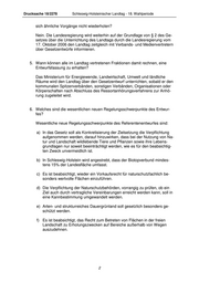 Drucksache 18/2278 Schleswig-Holsteinischer Landtag - 18. Wahlperiode sich ähnliche Vorgänge nicht wiederholen? Nein. Die Landesregierung wird weiterhin auf der Grundlage von § 2 des Ge- setzes über die Unterrichtung des Landtags durch die Landesregierung vom 17. Oktober 2006 den Landtag zeitgleich mit Verbands- und Medienvertretern über Gesetzentwürfe informieren. 5. Wann können alle im Landtag vertretenen Fraktionen damit rechnen, eine Entwurfsfassung zu erhalten? Das Ministerium für Energiewende, Landwirtschaft, Umwelt und ländliche Räume wird den Landtag über den Gesetzentwurf unterrichten, sobald er den kommunalen Spitzenverbänden, sonstigen Verbänden, Organisationen oder Körperschaften nach Abschluss des Ressortanhörungsverfahrens zur Anhö- rung zugeleitet wird. 6. Welches sind die wesentlichen neuen Regelungsschwerpunkte des Entwur- fes? Wesentliche neue Regelungsschwerpunkte des Referentenentwurfes sind: a) In das Gesetz soll als Konkretisierung der Zielsetzung die Verpflichtung aufgenommen werden, darauf hinzuwirken, dass bei der Nutzung von Na- tur und Landschaft wildlebende Tiere und Pflanzen sowie ihre Lebens- grundlagen nur soweit beeinträchtigt werden, wie es für den beabsichtig- ten Zweck unvermeidlich ist. b) In Schleswig-Holstein wird angestrebt, dass der Biotopverbund mindes- tens 15% der Landesfläche umfasst. c) Es ist beabsichtigt, wieder ein Vorkaufsrecht für naturschutzfachlich be- sonders wertvolle Flächen einzuführen. d) Die Verpflichtung der Naturschutzbehörden, vorrangig zu prüfen, ob ein Ziel auch durch vertragliche Vereinbarungen erreicht werden kann, soll in eine Kannbestimmung umgewandelt werden. e) Arten- und strukturreiches Dauergrünland soll gesetzlich besonders ge- schützt werden. f) Es ist beabsichtigt, das Recht zum Betreten von Flächen in der freien Landschaft zu Erholungszwecken auf Bereiche außerhalb von Wegen auszudehnen. 2