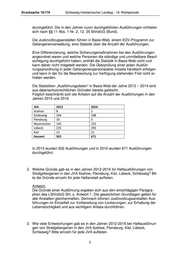 Drucksache 19/179 Schleswig-Holsteinischer Landtag - 19. Wahlperiode durchgeführt. Die in den Jahren zuvor durchgeführten Ausführungen richteten sich nach §§ 11 Abs. 1 Nr. 2, 12, 35 StVollzG (Bund). Die Justizvollzugsanstalten führen in Basis-Web, einem EDV-Programm zur Gefangenenverwaltung, eine Statistik über die Anzahl der Ausführungen. Eine Differenzierung, welche Sicherungsmaßnahmen bei den Ausführungen angeordnet waren und welche Personen die ständige und unmittelbare Beauf- sichtigung durchgeführt haben, enthält die Statistik in Basis-Web nicht und kann daher nicht mitgeteilt werden. Die Überprüfung einer jeden Ausfüh- rungsanordnung in jeder Gefangenenpersonalakte müsste händisch erfolgen und kann in der für die Beantwortung zur Verfügung stehenden Frist nicht er- hoben werden. Die Statistiken „Ausführungsdaten“ in Basis-Web der Jahre 2012 – 2014 sind aus datenschutzrechtlichen Gründen bereits gelöscht. Folglich beschränkt sich die Antwort auf die Anzahl der Ausführungen in den Jahren 2015 und 2016. JVA 2015 2016 Itzehoe 8 2 Schleswig 104 198 Flensburg 10 5 Neumünster 143 152 Lübeck 225 293 Kiel 12 21 Gesamt 502 671 In 2015 wurden 502 Ausführungen und in 2016 wurden 671 Ausführungen durchgeführt. 2. Welche Gründe gab es in den Jahren 2012-2016 für Haftausführungen von Strafgefangenen in den JVA Itzehoe, Flensburg, Kiel, Lübeck, Schleswig? Bit- te die Gründe einzeln für jede Haftanstalt auflisten. Antwort: Die Gründe einer Ausführung ergeben sich aus den einschlägigen Paragra- phen des LStVollzG SH, s. Antwort 1. Die gesetzlichen Grundlagen gelten für alle Anstalten gleichermaßen. Demnach können Justizvollzugsanstalten Aus- führungen im Einzelfall zur Vorbereitung von Lockerungen, zur Erhaltung der Lebenstüchtigkeit und aus wichtigem Anlass durchführen. 3. Wie viele Entweichungen gab es in den Jahren 2012-2016 bei Haftausführun- gen von Strafgefangenen in den JVA Itzehoe, Flensburg, Kiel, Lübeck, Schleswig? Bitte einzeln für jede JVA auflisten. 2