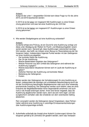 Schleswig-Holsteinischer Landtag - 19. Wahlperiode Drucksache 19/179 Antwort: Aufgrund der unter 1. dargestellten Gründe kann diese Frage nur für die Jahre 2015 und 2016 beantwortet werden: In 2015 ist es bei einer von insgesamt 502 Ausführungen zu einer Entwei- chung gekommen und zwar bei einer Ausführung der JVA Kiel. In 2016 ist es bei keiner von insgesamt 671 Ausführungen zu einer Entwei- chung gekommen. 4. Wie werden Strafgefangene auf eine Ausführung vorbereitet? Antwort: Zunächst erfolgt eine Prüfung, ob ein Grund für eine Ausführung vorliegt und diese unter Abwägung der Risiken für Flucht- und Missbrauchsgefahr verant- wortet werden kann. Generell gilt, dass Ausführungen zielorientiert durchge- führt werden, das heißt, sie müssen einen Bezug zur Resozialisierung der Ge- fangenen haben. Insbesondere folgende Punkte werden mit den Gefangenen vor einer Ausführung abgeklärt: - Der konkrete Zweck der Ausführung. - Der Ort der Ausführung. - Welche Bediensteten begleiten den Gefangenen? - Welche Personen aus dem Umfeld des Gefangenen sind während der Ausführung zugegen? - Welche besonderen Situationen können sich im Laufe der Ausführung er- geben? - Zeitlicher Rahmen der Ausführung und konkreter Ablauf. - Bekleidung der Gefangenen. - Kosten. Weiter werden den Gefangenen die Verhaltensregeln für eine Ausführung er- läutert, insbesondere die ständige und unmittelbare Beaufsichtigung durch die mit der Durchführung beauftragten Begleitpersonen oder auch eine notwendig erscheinende Fesselung. Die Gefangenen werden auch belehrt, dass sie ohne Erlaubnis der Begleitbediensteten keine Gegenstände annehmen und auch nicht in die Anstalt einbringen dürfen. Ihnen wird ferner mitgeteilt, dass die Ausführung abgebrochen werden kann, wenn sie sich nicht regel- und wei- sungskonform verhalten oder die Umstände von dem vereinbarten Setting abweichen. Rein vorsorglich werden die Gefangenen darauf hingewiesen, dass Fehlver- halten während einer Ausführung in zukünftige Ermessensentscheidungen über Ausführungsanträge einfließt. 5. Aufenthalte außerhalb der Anstalt ohne Aufsicht (Lockerungen) können Ge- fangenen gemäß § 55 LStVollzG SH gewährt werden, wenn das Verlassen 3