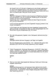 Drucksache 19/179 Schleswig-Holsteinischer Landtag - 19. Wahlperiode der Anstalt für bis zu 24 Stunden in Begleitung von der Anstalt zugelassenen ist. Gab es beim Begleitausgang in den Jahren 2012-2016 Entweichungen, und wenn ja, in welchen Justizvollzugsanstalten Schleswig-Holstein kam es zu dann zu Entweichungen? Bitte dann einzeln auflisten. Antwort: Wenn sich Gefangene im Rahmen eines Ausgangs der Begleitung entziehen und nicht pünktlich in die JVA zurückkehren, handelt es sich um eine Nicht- rückkehr und nicht um eine Entweichung. Aufgrund der unter 1. dargestellten Gründe wird diese Frage für die Jahre 2015 und 2016 beantwortet: In 2015 sind alle Gefangenen aus einem begleiteten Ausgang pünktlich in die Anstalt zurückgekehrt. In 2016 haben sich zwei Gefangene bei einem begleiteten Ausgang der Be- gleitung entzogen. Es handelte sich dabei um einen Strafgefangenen der JVA Neumünster und eine Strafgefangene der JVA Lübeck. 6. Wie viele Vollzugsbeamte begleiten einen Gefangenen während eines Aus- ganges? Antwort: Gefangene werden bei einem Ausgang in der Regel nicht begleitet. Bei einem Begleitausgang nach § 55 Abs. 1 Nr. 1 LStVollzG SH werden Straf- gefangene durch eine von der Anstalt zugelassene Person begleitet. 7. Treffen Presseberichte (Hamburger Morgenpost v. 24.08.2017, Kieler Nach- richten v. 24.08.2017) zu, dass der am 22. August 2017 geflohene Gefangene während seines Ausganges lediglich von einem Bediensteten der JVA und ei- nem Seelsorger begleitet wurde? Antwort: Ja. 8. Wenn ja, ist es üblich, dass begleitende Seelsorger hierbei auch Sicherungs- aufgaben übernehmen? Antwort: Begleitende Seelsorgerinnen und Seelsorger haben während einer Ausfüh- rung die Pflicht, den Gefangenen „ständig und unmittelbar zu beaufsichtigen“, siehe § 54 Abs. 1 LStVollzG SH. Diese Aufgabe obliegt jeder Person, die an einer Ausführung teilnimmt. 4