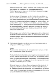 Drucksache 18/4340 Schleswig-Holsteinischer Landtag - 18. Wahlperiode Schleswig-Holstein hatte zudem in zwei dieser sechs Arbeitsgruppen jeweils den Co-Vorsitz auf Länderseite („AG Audiovisuelle Mediendienste- Richtlinie“ gemeinsam mit Bayern und „AG Kartellrecht / Vielfaltssicherung“ ge- meinsam mit Baden-Württemberg). Um die komplexen Verhandlungen von Bund und Ländern operabel zu ma- chen, sind beide Seiten bei Verhandlungsbeginn übereingekommen, zur Klä- rung strittiger politischer Fragen, die auf Arbeitsebene nicht ausgeräumt wer- den können, eine „gemeinsame Steuerungsgruppe auf politischer Ebene“ ein- zurichten. Wie in solchen politischen Gremien üblich, haben sich die Länder vorher darauf geeinigt, nur eine begrenzte Anzahl von Ländervertretern in die- se Steuerungsgruppe zu entsenden. Neben dem Vorsitzland der Rundfunk- kommission (Rheinland-Pfalz) waren dies die Länder, welche die sechs Ar- beitsgruppen geleitet haben. Entscheidungen dieser politischen Steuerungsgruppe wurden vorab jeweils in der Rundfunkkommission beraten, so dass die Interessen aller Länder - auch Schleswig-Holsteins - während des gesamten Verfahrens berücksichtigt und gewahrt werden konnten. 2. Arbeitet die Landesregierung in ähnlich verorteten Kommissionen oder Ar- beitsgruppen mit? Wenn ja, in welchen? Antwort: Ähnlich verortete Kommissionen, die sich aus Vertretern von Bund und Län- dern zusammensetzen, gibt es aktuell nicht. Rundfunk in Deutschland ist Ländersache. Regelungen, die alle Länder betref- fen, sind im Rundfunkstaatsvertrag der Länder fixiert, der regelmäßig an tech- nische und inhaltliche Entwicklungen angepasst wird. Die Rundfunkkommissi- on setzt hierfür seit jeher Arbeitsgruppen ein, um die entsprechenden medien- politischen Entscheidungen vorzubereiten. Schleswig-Holstein hat in diesem Zusammenhang aktuell den Vorsitz der Ar- beitsgruppen „Medienkonzentrationsrecht“, „Hörfunk“ und „Großereignislis- te“ sowie den Co-Vorsitz der „AG Europa“. Die Landesregierung legt darüber hinaus großen Wert darauf, auch alle anderen Arbeitsgruppen im Rahmen der personellen Möglichkeiten inhaltlich zu begleiten. 2