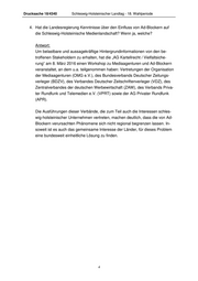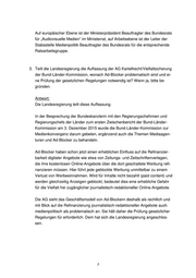 Auf europäischer Ebene ist der Ministerpräsident Beauftragter des Bundesrats für „Audiovisuelle Medien“ im Ministerrat, auf Arbeitsebene ist der Leiter der Stabsstelle Medienpolitik Beauftragter des Bundesrats für die entsprechende Ratsarbeitsgruppe. 3. Teilt die Landesregierung die Auffassung der AG Kartellrecht/Vielfaltsicherung der Bund-Länder-Kommission, wonach Ad-Blocker problematisch sind und ei- ne Prüfung der gesetzlichen Regelungen notwendig ist? Wenn ja, bitte be- gründen. Antwort: Die Landesregierung teilt diese Auffassung. In der Besprechung der Bundeskanzlerin mit den Regierungschefinnen und Regierungschefs der Länder zum ersten Zwischenbericht der Bund-Länder- Kommission am 3. Dezember 2015 wurde die Bund-Länder-Kommission zur Medienkonvergenz darum gebeten, ergänzend auch die Themen Mediaagen- turen und Ad-Blocker zu behandeln. Ad-Blocker haben schon jetzt einen erheblichen Einfluss auf die Refinanzier- barkeit digitaler Angebote wie etwa von Zeitungs- und Zeitschriftenverlagen, die ihre kostenlosen Online-Angebote über die dort geschaltete Werbung refi- nanzieren müssen. Hier führt jede geblockte Werbung unmittelbar zu einem Verlust von Werbeeinnahmen. Wird für Inhalte nicht bezahlt (paid content) und werden gleichzeitig Anzeigen geblockt, bedeutet dies eine erhebliche Gefahr für die Vielfalt frei zugänglicher journalistisch-redaktioneller Online-Angebote. Die AG sieht das Geschäftsmodell von Ad-Blockern deshalb als rechtlich und mit Blick auf die Refinanzierung journalistisch-redaktioneller Angebote auch medienpolitisch als problematisch an. Sie hält daher die Prüfung gesetzlicher Regelungen für erforderlich. Dem hat sich die Landesregierung angeschlos- sen. 3