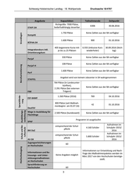 Schleswig-Holsteinischer Landtag - 18. Wahlperiode Drucksache 18/4797 Angebote Kapazitäten Teilnehmende Zeitpunkt Richtgröße: 7000 Plätze, 6306 30.06.2016 STAFF.SH bedarfsabhängig steuerbar 1.750 Plätze Keine Zahlen aus der BA verfügbar Grundlagen KompAS 1.600 Plätze 900 01.10.2016 BÜFAA.SH 405 begonnene Kurse mit 6.555 (inklusive Kurs- 30.09.2016 (Stich- Integrationskurs inkl. je bis zu 25 Plätzen wiederholer) tag) Orientierungskurs 330 Plätze Keine Zahlen aus der BA verfügbar PerjuF 108 Plätze Keine Zahlen aus der BA verfügbar Berufsorientierung PerjuF-H 1.600 Plätze Keine Zahlen aus der BA verfügbar PerF Angebot wird von keinem Jobcenter in SH wahrgenommen STAFFEL 764 Plätze (in Landesunter- künften), Keine Zahlen aus der BA verfügbar 2.291 Plätze (bei externen FIM Trägern) Sprachförde- 1.260 Plätze (2016) 769 04.10.2016 ESF-BAMF 800 Plätze (seit Maßnah- 42 01.10.2016 menbeginn am 01.07.16) DeuFöV Schule und Be- Ausbildungs- Wege in Ausbildung für 2.500 Plätze (bundesweit) Keine Zahlen aus der BA verfügbar rung Flüchtlinge Programm ist ausgelaufen SPAF Aufnahmen im entsprechend der Schul- rufsschule vorbeiteung 4.160 Schüler Schuljahr 2015/ pflicht BiK DaZ 2016 Aufnahmen im entsprechend der Schul- 5.800 Schüler Schuljahr 2015/ pflicht AV-SH 2016 Zugangserleichterungen 60 an Hochschulen Hochschulzugang Informationen zur Entwicklung und Nach- Informationen und Be- frage des Maßnahmenpaketes werden im treuungs- und Unter- Keine Angaben möglich März 2017 von den Hochschulen bereitge- stützungsmaßnahmen stellt. an Hochschulen Sprachförderung an Hochschulen 60 3