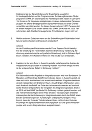 Drucksache 18/4797 Schleswig-Holsteinischer Landtag - 18. Wahlperiode Ergänzend sei zur Sprachförderung für Erwachsene ausgeführt: Im landesgeförderten und die Programme des Bundes ergänzenden Förder- programm STAFF.SH (Starterpaket für Flüchtlinge in SH) haben im Jahr 2015 184 Kurse an 74 Standorten stattgefunden, in denen insbesondere Personen- gruppen mit offener Bleibeperspektive Sprachkenntnisse und erste Orientie- rungshilfen vermittelt wurden. An diesen Kursen nahmen 3.271 Personen teil. Im ersten Halbjahr 2016 fanden bereits 160 STAFF.SH-Kurse mit 3.035 Teil- nehmenden statt. Darüber hinausgehende Anmeldezahlen liegen nicht vor: 3. Welche externen Gutachter waren an der Entwicklung der Förderketten betei- ligt und welche Kosten sind hierdurch entstanden? Antwort: An der Erstellung der Förderketten wardie Firma Syspons GmbH beteiligt. Für die Erstellung der Förderketten (fachliche Erarbeitung, Validierung, Ab- stimmung sowie technische und grafische Umsetzung) sind im Zeitraum April bis 31. Oktober 2016 Kosten in Höhe von 110.455,80 Euro entstanden. 4. Inwiefern ist der vom Bund in Aussicht gestellte bedarfsgerechte Ausbau der Integrationskurskapazitäten in Schleswig-Holstein noch nicht erfolgt und wie ist der entsprechende Bedarf in Schleswig-Holstein? Antwort: Ein flächendeckendes Angebot an Integrationskursen wird vom Bundesamt für Migration und Flüchtlinge (BAMF) bis Ende des Jahres in Aussicht gestellt, ist aber noch nicht abschließend und ausreichend realisiert. Engpässe bestehen derzeit insbesondere im ländlichen Raum. Aktuell längere Wartezeiten sollen nach Auskunft des BAMF bis Ende des Jahres verkürzt werden auf maximal sechs Wochen entsprechend der Vorgaben des Integrationsgesetzes. Bis En- de 2016 soll laut BAMF der Bedarf für Schleswig-Holstein gedeckt werden und alle Teilnahmeberechtigten einen Platz erhalten. Verzögerungen entstehen insbesondere bei der Zulassung zu Integrationskursen durch das BAMF sowie bei den Zertifizierungen von Kursleitungen und Sprachkursträgern. Hinzu kommt, dass der Kreis der Teilnahmeberechtigten nicht mit dem Kreis der Flüchtlinge mit Sprachförderbedarf deckungsgleich ist: Eine große Personen- gruppe wird so vom Integrationskurs ausgeschlossen. 4
