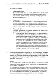Schleswig-Holsteinischer Landtag - 18. Wahlperiode Drucksache 18/4797 Die Zahlen im Einzelnen: i. Zugangsberechtigung: Zwischen dem 01.01.2015 und dem 27.10.2016 sind ca. 30.000 volljäh- rige Flüchtlinge nach Schleswig-Holstein gekommen. Davon haben oder hatten ca. 19.000 volljährige Flüchtlinge eine Zugangsberechti- gung zum Integrationskurs. ii. Kurseintritte: In 2015 haben in Schleswig-Holstein 317 Integrationskurse begonnen mit einer Teilnehmerzahl (ohne Wiederholer) von 4400 Personen. In 2016 haben mit Stichtag 30.09.2016 405 Integrationskurse begonnen mit einer Teilnehmerzahl von 6.555 Personen (inklusive Wiederholer). iii. Prognose für 2016: Das BAMF prognostiziert für Schleswig Holstein für das Jahr 2016 ins- gesamt 14.550 neue Kurseintritte. • Sollte das BAMF seine Prognose von 14.550 neuen Kurseintrit- ten in 2016 erreichen, könnte das Angebot für den vom Bund ins Auge gefassten Personenkreis in etwa bedarfsdeckend sein. • Kein bedarfsgerechtes Angebot besteht dagegen für Flüchtlinge, die dauerhaft ohne Zugangsberechtigung bleiben. (vgl. Antwort zu Frage 5). Um auch für diese Gruppe ein bedarfsgerechtes Angebot an Integrationskursen oder anderen Integrationsange- boten zu etablieren, sind weitere Anstrengungen notwendig. Bund und Land haben verschiedene Maßnahmen eingeleitet, um eine bedarfsgerechte Versorgung mit Sprachförderangeboten zur Verfügung zu stellen (vgl. Antwort zu Frage 6). 5. Liegen der Landesregierung Erkenntnisse vor, ob Flüchtlinge bzw. Asylbewer- ber in Schleswig-Holstein keinen Platz in den vom Bund bzw. Bundesamt für Migration und Flüchtlinge geförderten oder angebotenen Kursen erhalten bzw. wie lang die Wartezeiten derzeit gegebenenfalls sind? Wenn ja, welche? Wenn nein, warum nicht? Antwort: Bei den vom Bund bzw. dem Bundesamt für Migration und Flüchtlinge (BAMF) angebotenen Kursen handelt es sich im Wesentlichen um die Integrationskur- se und die ESF-BAMF Kurse. Die Wartezeiten bis zum Beginn eines Integrationskurses sind regional unter- schiedlich. Im Durchschnitt liegen diese mit Stichtag 01.06.2016 bei drei Vier- teln der Kursträger bei fünf bis sechs Wochen, wohingegen bei einem Viertel der Kursträger die Wartzeiten bei bis zu drei Monaten liegen. Im ländlichen Raum sind die Wartezeiten durchschnittlich länger als in Großstädten. 5