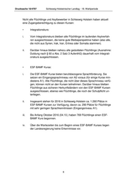 Drucksache 18/4797 Schleswig-Holsteinischer Landtag - 18. Wahlperiode Nicht alle Flüchtlinge und Asylbewerber in Schleswig Holstein haben aktuell eine Zugangsberechtigung zu diesen Kursen: • Integrationskurs: i. Vom Integrationskurs bleiben alle Flüchtlinge im laufenden Asylverfah- ren ausgeschlossen, die keine gute Bleibeperspektive haben (also alle, die nicht aus Syrien, Irak, Iran, Eritrea oder Somalia stammen). ii. Darüber hinaus bleiben nahezu alle geduldeten Flüchtlinge (Ausnahme: Duldung nach § 60 a Abs. 2 Satz 3 AufenthG) dauerhaft vom Integrati- onskurs ausgeschlossen. • ESF-BAMF Kurse: i. Die ESF-BAMF Kurse bieten berufsbezogene Sprachförderung. Sie setzen ein Eingangssprachniveau von A2 voraus (für einige Kurse min- destens A1). Alle Flüchtlinge, die nicht über dieses Sprachniveau verfü- gen, können nicht an den Kursen teilnehmen. Darüber hinaus bleiben Flüchtlinge aus sicheren Herkunftsländern von den ESF-BAMF Kursen ausgeschlossen, ebenso wie Flüchtlinge, die noch der Schulpflicht un- terliegen. ii. Insgesamt stehen für 2016 in Schleswig-Holstein ca. 1.260 Plätze in ESF-BAMF Kursen zur Verfügung, davon ca. 290 Plätze für Flüchtlinge mit sehr geringen Sprachkenntnissen (Eingangsniveau A1). iii. Bis Anfang Oktober 2016 (04.10.) haben 769 Flüchtlinge einen ESF- BAMF Kurs begonnen. iv. Über die Wartezeiten bis zum Beginn eines ESF-BAMF Kurses liegen der Landesregierung keine Erkenntnisse vor. 6