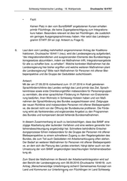 Schleswig-Holsteinischer Landtag - 18. Wahlperiode Drucksache 18/4797 • Fazit: Keinen Platz in den vom Bund/BAMF angebotenen Kursen erhalten primär Flüchtlinge, die keine Zugangsberechtigung zum Integrations- kurs haben. Besonders relevant ist dies bei Flüchtlingen, die zusätzlich ein geringes Ausgangssprachniveau haben. Hier setzt das Landespro- gramm STAFF.SH an (vgl. Antwort zu Frage 6). 6. Laut dem vom Landtag mehrheitlich angenommenen Antrag der Koalitions- fraktionen, Drucksache 18/4411 (neu), wird die Landesregierung aufgefordert, "die integrationsfeindlichen und ausgrenzenden Elemente des Bundesintegra- tionsgesetzes abzumildern, indem sie Maßnahmen trifft, Integrationsangebote für alle zu schaffen bzw. zu erhalten". Welche konkreten Maßnahmen hat die Landesregierung hier bisher ergriffen und welche weiteren Maßnahmen plant die Landesregierung? Bitte nach Maßnahmen für Personen mit offener Blei- beperspektive und die Gruppe der Geduldeten aufschlüsseln. Antwort: Mit der am 27.09.2016 rückwirkend zum 01.07.2016 in Kraft getretenen Sprachförderrichtlinie des Landes verfolgt das Land primär das Ziel, Sprach- kenntnisse sowie erste Orientierungshilfen insbesondere für Personengruppen zu vermitteln, die einer sprachlichen Förderung im Rahmen von Erstorientie- rung bedürfen, ihren Wohnsitz in Schleswig-Holstein haben und von Maß- nahmen der Sprachförderung des Bundes ausgeschlossen sind. Zielgruppe der neuen Richtlinie sind insbesondere Personen mit offener Bleibeperspekti- ve, die derzeit nicht von der Öffnung der Bundeskurse profitieren. Die Förde- rung wirkt als flankierendes und ergänzendes Angebot zu den Programmen des Bundes und kompensiert derzeit fehlende Bundesmaßnahmen. In diesem Zusammenhang ist auch zu berücksichtigen, dass das BAMF eine zügige Abarbeitung aller laufenden Verfahren und eine weitere generelle Ver- fahrensbeschleunigung angekündigt hat. Schnellere behördliche Entschei- dungsprozesse führen insbesondere für die Gruppe der Personen mit offener Bleibeperspektive zu einem schnelleren Zugang zu den Regelangeboten des Bundes, die zum Teil auch Geduldeten mit Arbeitsmarktzugang offen stehen. Der Bedarf an weiteren Maßnahmen für Personen mit offener Bleibeperspekti- ve, an dem sich die Planung des Landes orientiert, hängt daher auch von der Umsetzung der vom BAMF angekündigten beschleunigten Verfahrensbearbei- tung ab. Zum Stand der Maßnahmen im Bereich der Arbeitsmarktintegration wird auf den Bericht der Landesregierung vom 08.09.2016 (Drucksache 18/4619) zum Antrag „Menschenwürdige Unterbringung sichern! Gemeinsames Konzept von Land und Kommunen zur Unterbringung von Flüchtlingen im Land Schleswig- 7