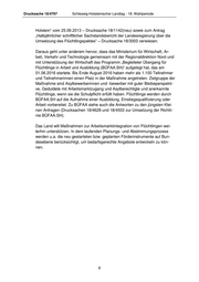 Drucksache 18/4797 Schleswig-Holsteinischer Landtag - 18. Wahlperiode Holstein“ vom 25.09.2013 – Drucksache 18/1142(neu) sowie zum Antrag „Halbjährlicher schriftlicher Sachstandsbericht der Landesregierung über die Umsetzung des Flüchtlingspaktes“ – Drucksache 18/3003 verwiesen. Daraus geht unter anderem hervor, dass das Ministerium für Wirtschaft, Ar- beit, Verkehr und Technologie gemeinsam mit der Regionaldirektion Nord und mit Unterstützung der Wirtschaft das Programm „Begleiteter Übergang für Flüchtlinge in Arbeit und Ausbildung (BÜFAA.SH)“ aufgelegt hat, das am 01.06.2016 startete. Bis Ende August 2016 haben mehr als 1.100 Teilnehmer und Teilnehmerinnen einen Platz in der Maßnahme angetreten. Zielgruppe der Maßnahme sind Asylbewerberinnen und -bewerber mit guter Bleibeperspekti- ve, Geduldete mit Arbeitsmarktzugang und Asylberechtigte und anerkannte Flüchtlinge, wenn sie die Schulpflicht erfüllt haben. Flüchtlinge werden durch BÜFAA.SH auf die Aufnahme einer Ausbildung, Einstiegsqualifizierung oder Arbeit vorbereitet. Zu BÜFAA siehe auch die Antworten zu den jüngsten Klei- nen Anfragen (Drucksachen 18/4628 und 18/4503 zur Umsetzung der Richtli- nie BÜFAA.SH). Das Land will Maßnahmen zur Arbeitsmarktintegration von Flüchtlingen wei- terhin unterstützen. In dem laufenden Planungs- und Abstimmungsprozess werden u.a. die neu gestarteten bzw. geplanten Förderinstrumente auf Bun- desebene berücksichtigt, um bedarfsgerechte Angebote entwickeln zu kön- nen. 8