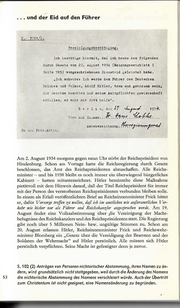 ... und der Eid auf den Führer Io.h bestätige hiezolnit; daß ich hettte de n folJ$end~n du~c.h tt~aet-z vo,m 20t Aug~st t9)4 {Reichsgesetzb latt 1 Seite 785.} •Qrgesoh riebenen Diensteid &eleistet habe~ "Ich ao.hwöre t ! eh werde d;em. Ftthr~r des Deutschen U~ iche s u.nd Yolkea, Ad.oU llitlert tre.u. und ge.horsalil s~.1.n, > die ~eset ze beacht en und meine Am ~spflichten gewiseenhatt ' • Am 2. August 1934 morgens gegen neun Uhr stirbt der Reichspräsident von Hindenburg. Schon am Vortage hatte die Reichsregierung durch Gesetz beschlossen, das Amt des Reichspräsidenten abzuschaffen. Alle Reichs- minister - und bis 1938 bleibt es noch immer ein überwiegend bürgerliches Kabinett - hatten mitunterzeichnet. Hitler bemäntelte diese Maßnahme pietätvoll mit dem Hinweis darauf, daß der Titel Reichspräsident für immer mit der Perso~ des verstorbenen Reichspräsidenten verbunden bleiben solle. In einem als Erlaß veröffentlichten Brief an Reichsinnenminister Frick bittet er, dafür Vorsorge treffen zu wollen, daß ich im amtlichen wie außeramtlichen Ver- kehr wie bisher nur als Führer und Reichskanzler angesprochen 1verde. Am 19. August findet eine Volksabstimmung über ,die Vereinigung der Macht- befugnisse des Reichskanzlers und des Reichspräsidenten statt. Die Regierung gibt noch über 5 Millionen Nein- bzw. ungültige Stimmen zu. Schon am 20. August erlassen Hitler, Reichsinnenminister Frick und Reichswehr- minister Biomberg ein "Gesetz über die Vereidigung der Beamten und der Soldaten der Wehrmacht" auf Hitler persönlich. Alle müssen sich Hitler persönlich verpflichten. Seine Macht ist gefestigter denn je zuvor. S. 102 (2) Anträgen von Personen nichtarischer Abstammung, ihren Namen zu än- dern, wird grundsätzlich nichfstattgegeben, weil durch die Änderung des Namens 3 die nichtarische Abstammung des Namens verschleiert würde. Auch der Übertritt zum Christentum ist nicht geeignet, eine Namensänderung zu begründen. I