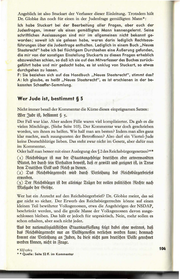 O:tb~ofbauet 3U befit2en unb 3U bebauen, ~Um O:~tenbienft am beutfd)en QJo(fe, wie ®e~rbienfl unb ~tbeitsbienfl, 3ugelaffen ~u werben, am fultureUen Eeben :Veutfd)lanbs mitaugeflalten, b. b. Stufturfammermitgfieb, ®d)tiftleiter, stünfller, ~~eatedeitet ufw. werben au fönnen, imitglieb bet betufsftänbifd)en Organt~ fationen fein 3u fönnen, ober auf beutfd)en ®d)ufen unb ~od)fd)ulen O:t~ie~ung, ~ilbung unb ~ormung au er~aften, ~ängt von bet ,3uge~ötigfeit bes einaelnen ~u ben blutmäf3ig l'etfd)iebenen @ruppen ab. ~m bebeutungsvoUflen ifl bie Bu~ ge~örigfeit au ber einen ober anbeten biefet ~Jruppen für bie ~rage bet O:~efd)Iießung. :Das :Subentum ifl alfo nid)t nur ein raffebiologifd)es~ O:s beburfte aud) in polb tifd)et, wittfd)aftlid)er unb f.oaiologifd)et ~inffd)t einer ~öfung für bie Sa~r~ tunbette . . . Seite 16 •.• :Ver Sube ifl uns völlig fremb nad) R)fut unb ®efen. :Ves~alb ifl bie :Viffh mtlation bie einaig möglid)e Eöfung. . • Seite 17 :Das .3iel einet gefet21id)en ~Öfung bet W?ifd)fingsfrage mut3te bas balbige mer~ fd)winben bet m?ifd)raffe fein . ; . Seite 18 -..0 ®er breiviertel ober me~r jübifd)e O:rbmaffe ~at, gilt bal)er ol)ne weiteres als Sube; besgfeid)en wirb berjenige ~eil ber ~albjuben, ben bereits bas ~eben burd) ffieli~ gionsbefenntnts ober ~eirat aum :5ubentum fottiett ~at, aud) red)tfid) bem ~uben:: turn 3Ugeteift, Um fein ~ufge~en im :5ubentum 3U befd)leunigen. ®et Dagegen weniger als einviertel jübifd)e O:rbmaffe ~at, alfo ber ~d)teL: unb ®ed)ae~nteljube ufw. wirb grunbfä~lid) ben :Veutfd)blütigen gleid)bel)anbeit. mad) bet gefe~Iid)en ~egtiffsbeflimmung ift ba~et jübifd)et ffilifd)fing im ffied)ts~ f{nne nur ber beutfd)e ®taatsangel)ötige, bet von einem ober awei ber ffiaffe nad) t)OUjübifd)en ®rot3eftern abflammt, fofern er nid)t nad) § 5 ~bf. 2 ber O:rflen merorbnung ~um ffieid)sbürgergefe~ als :Sube gift. :Davon ifl ro?ifd)ling etflen ®rabes ber ffi?ifd)fing mit aur ~äffte jübifd)er O:r6maffe, ro?ifd)Iing aroeiten @rabes bet OO?ifd)fing mit ein miettel jübifd)et ctrßmaffe. :Damit ifl bet gefe~Iid)e ~egtiff bes jübifd)en OO?ifd)lings auf ben nid)t aum :Subentum tenbierenben ~eil ber S)albjuben auf bie mterteljuben befd)tänft. :Die gefe~lid)e ~e~anblung bet 9J1ifd)Iinge ge~t l'on bet ctrfenntnis aus, bat3 f{e weber wefensgleid) ben :Veutfd)en nod) wefensgleid) ben Suben finb. :Dabei befle~t in ber ~e~anblung oftmals ein Unterfd)ieb, je nad)bem, ob es fiel) um IDlifd)linge erflen ober aweiten ®rabes l)anbelt. ~eibe @ruppen unterliegen aud) weiter~in grunbfä~lid) ben in anbeten ffieid)s~ gefet2en bisl)er aufgefleUten 2(nfotberungen an bie ffiein~eit bes ~lutes. ~m ~inblicf auf bie ~dl)igfeit, Q)eamte, Of~3iere, ~ed)tsanwälte, O:rß~ofbauern, ®d)riftleitet ufw. 3u werben, l'erbleibt es bei bem burd) bas ffieid)sbeamtengefef2 t)Om 30. Suni I 933, bas ®e~rgefef2 vom 2 I. ~ai I 935 ufw. für bie jübifd)en IDlifd)linge gefd)affenen ffied)tsauflanb. :Das bebeutet, bat3 fie aud) in ,3ufunft nid)t ~eamte, Of~3iere, ffied)tsanwäfte, ctrb~ofbauern, ®d)riftleiter ufw. werben fönnen . . . Seite 19 • :Die ffiegelung bes ct~ered)ts erreid)t neben bem ~auptaiel bet ffieiner~altung bes beutfd)en ~lutes, baf3 baß ins beutfd)e [5off eingebrungene jübifd)e ~lut foroeit als möglid) wieber ausgefd)ieben wirb, unb baf3, foroeit eine fold)e ~us~ fd)eibung nid)t me~r möglid) ifl, bie an beutfd)e ctrbmaffe gebunbene jübifd)e ~rbmaffe möglid)ft fd)neu unb immer weiter aufgeteilt wirb, bis burd) bie mit 101 jeber ®eneration fottfd)reitenbe ~bfd)wäd)ung bes jübifd)en ~Iuteinfd)lags bte enttlanbene m?ifd)raffe praftifd) t>erfd)rounben tfl. Seite 19